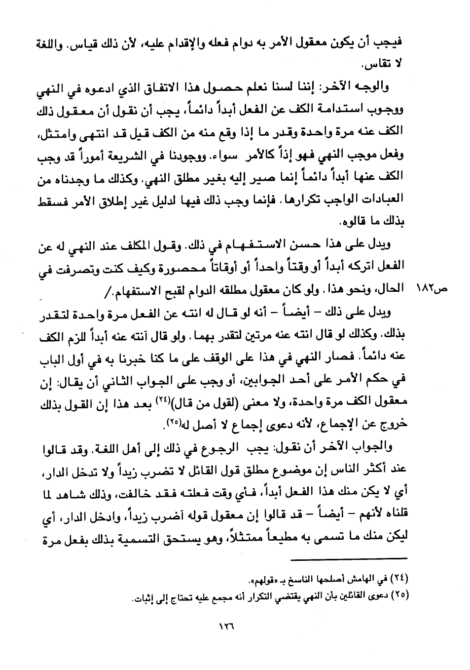 ويدل على هذا حسن الاستفهام في ذلك وقول المكلف عند النهي له عن الفعل أتركه أبداً أو وقتاً واحداً أو أوقات محصورة وكيف كنت وتصرفت في الحال، ونحو هذا. ولو كان معقول مطلق الدوام لقبح الاستفهام./ ويدل على ذلك - أيضاً- أنه لو قال له إنه عن الفعل مرة واحدة لتقدر بذلك. وكذلك لو قال انته عنه مرتين لتقدر يهما. ولو قال أنته عنه أبداً للزم الكف عنه دائماً. فصار النهي في هذا على الوقف على ما كنا خبرنا به في أول الباب في حكم الأمر على أحد الجوابين، أو وجب على الجواب الثاني أن يقال: إن معقول الكف مرة واحدة، ولا معني (لقول من قال) بعد هذا إن القول بذلك خروج عن الإجماع، لأنه دعوي لا أصل له.