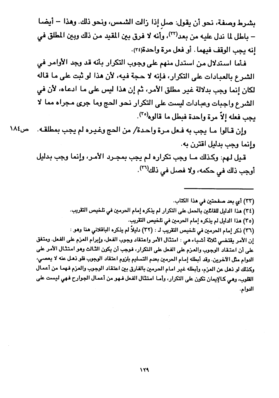 بشرط وصفة، نحو أن يقول: صل إذا زالت الشمس، ونحو ذلك. وهذا - أيضاً- باطل لما ندل عليه من بعد، وأنه لا فرق بين المقيد من ذلك وبين المطلق في إنه يجب الوقف فيهما. أو فعل مرة واحدة.