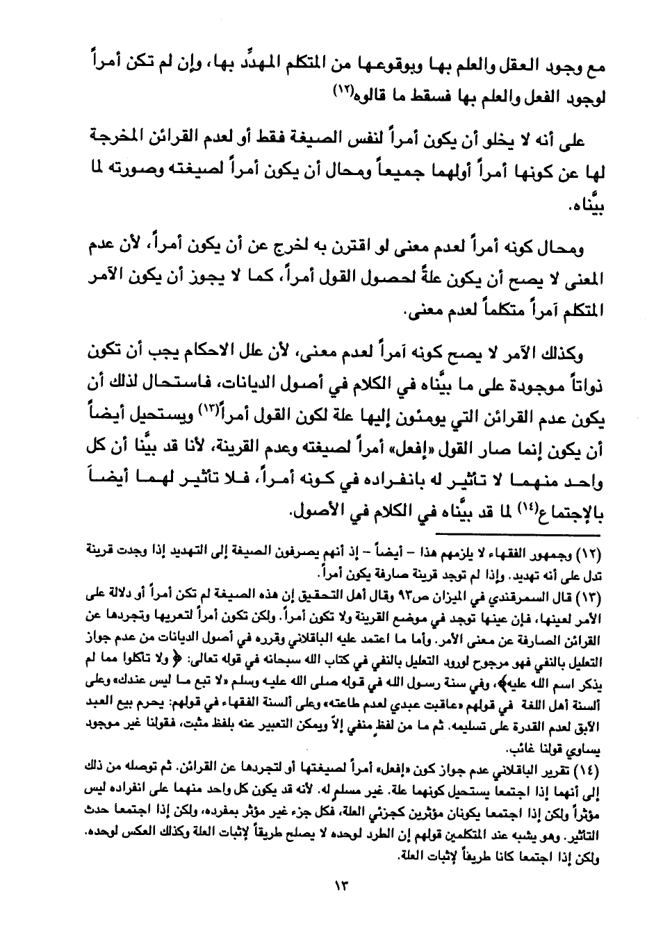 وكذلك الآمر لا يصح كونه أمرا لعدم معنى، لأن علل الأحكام يجب أن تكون ذواتا موجودة على ما بيناه في الكلام في أصول الديانات, فاستحال لذلك أن يكون عدم القرائن التي يومئون إليها على لكونه القول أمرا ويستحيل أيضا أن يكون إنما صارب القول"إفعل" أمرا لصيغته وعدم القرينة, لأنا قد بينا أن كل واحد منهما لا تأثير له بانفراده في كونه أمرا، فلا تأثير لهما أيضا بالإجماع لما قد بيناه في الكلام في الأصول.