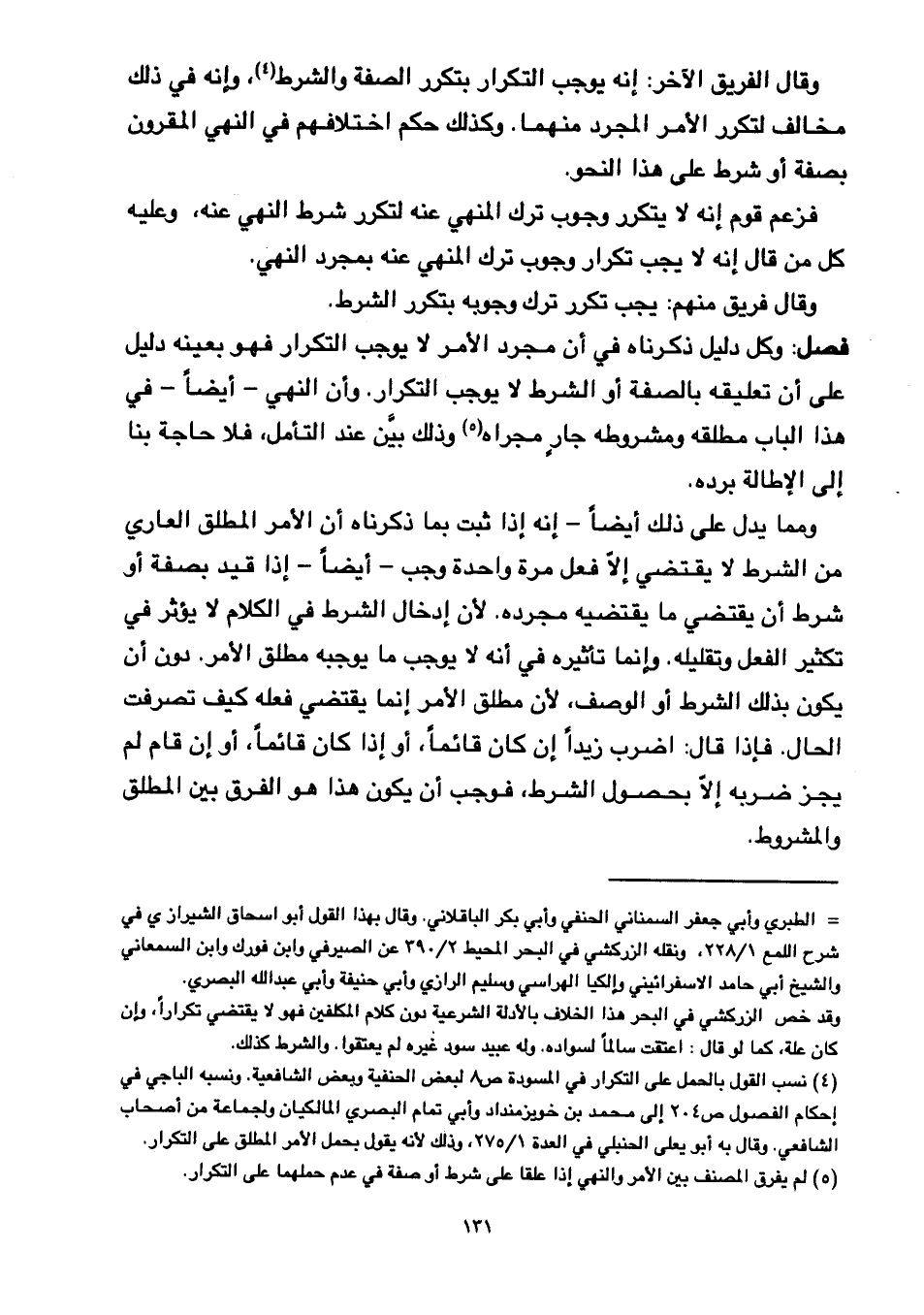 وقال الفريق الآخر: إنه يوجب التكرار بتكرر الصفة والشرط، وإنه في ذلك مخالف لتكرر الأمر المجرد منهما. وكذلك حكم اختلافهم في النهي المقرون بصفة أو شرط على هذا النحو.