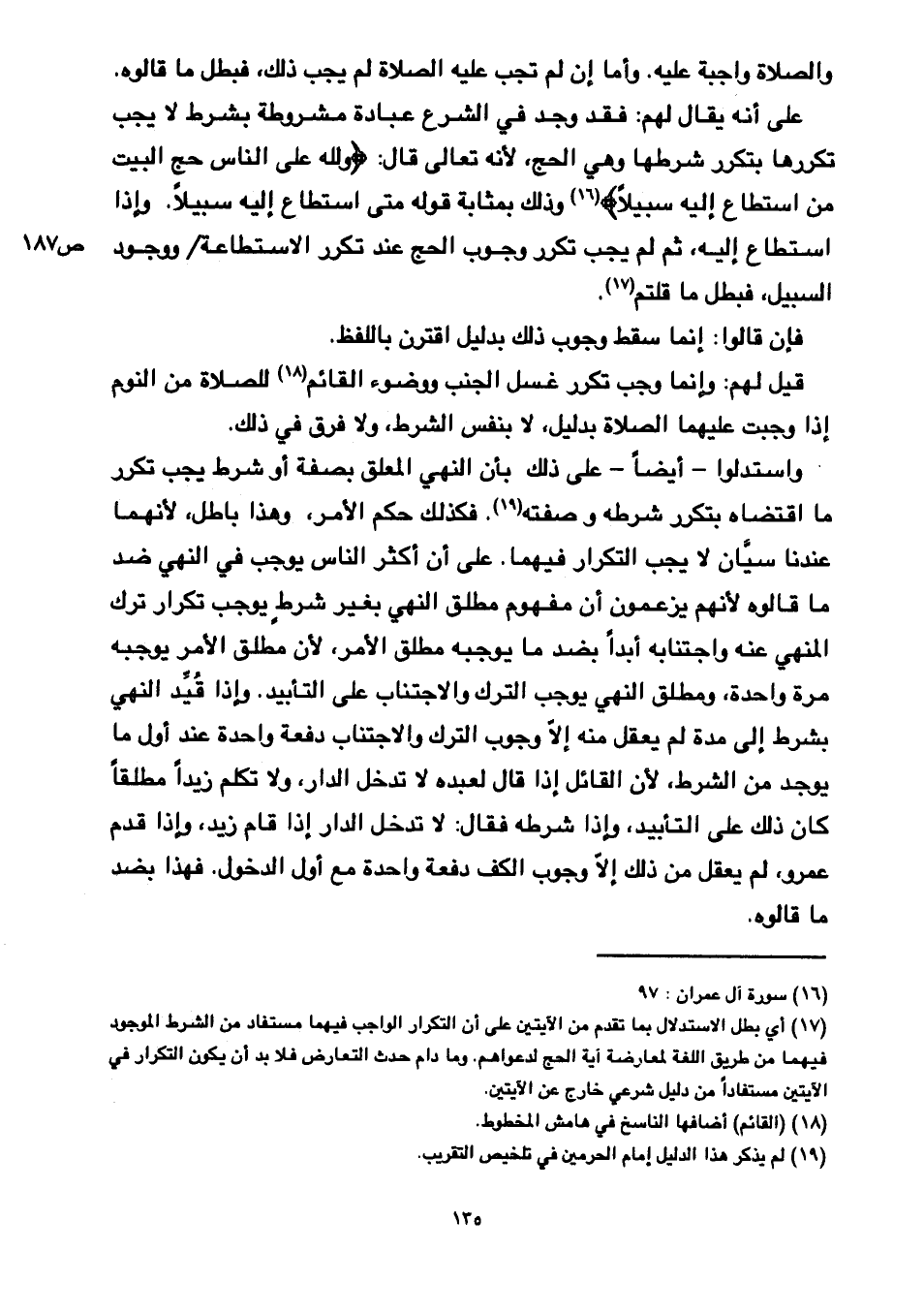 على أنه يقال لهم: فقد وجد في الشرع عبادة مشروطة بشرط لا يجب تكررها بتكرر شرطها وهي الحج، لأنه تعالى قال: {ولِلَّهِ عَلَى النَّاسِ حِجُّ البَيْتِ مَنِ اسْتَطَاعَ إلَيْهِ سَبِيلاً} وذلك بمثابة قوله متى استطاع إليه سبيلاً. وإذا استطاع إليه، ثم لم يجب تكرر وجوب الحج عند تكرر الاستطاعة/ ووجود ص ١٨٧ السبيل، فبطل ما قلتم.