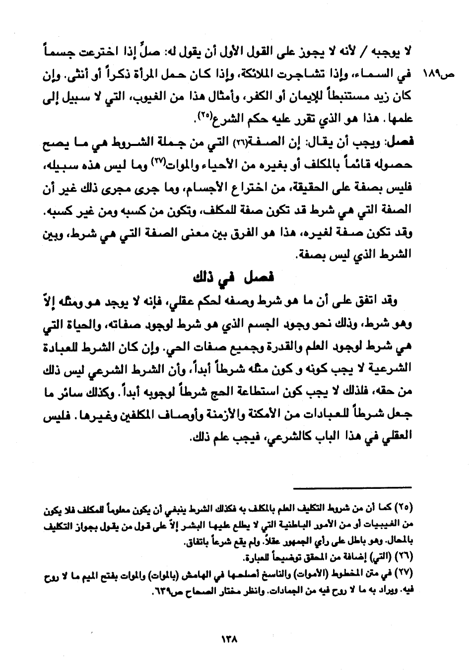 وقد اتفق على أن ما هو شرط وصفه لحكم عقلي، فإنه لا يوجد هو ومثله إلا وهو مشرط، وذلك نحو وجود الجسم الذي هو شرط لوجود صفاته، والحياة التي هي شرط لوجود العلم والقدرة وجميع صفات الحي. وإن كان الشرط للعبادة الشرعية لا يجب كونه وكون مثله شرطاً أبداً، وأن الشرط الشرعي ليس ذلك من حقه، فلذلك لا يجب كون استطاعة الحج شرطاً لوجوبه أبداً. وكذلك سائر ما جعل شرطاً للعبادات من الأمكنة والأزمنة وأوصاف المكلفين وغيرها. فليس العقلي في هذا الباب كالشرعي، فيجب علم ذلك.