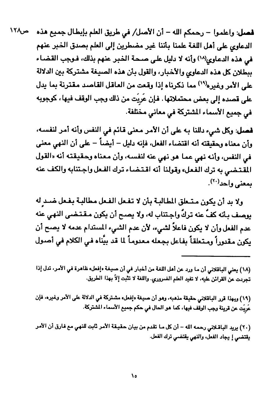 فصل: واعلموا- رحمكم الله- أن الأصل ⦗١٢٨⦘ في طريق العلم بإبطال جميع هذه الدعاوي على أهل اللغة علمنا بأننا غير مضطرين إلى العلم بصدق الخبر عنهم في هذه الدعاوي وأنه لا دليل على صحة الخبر عنهم بذلك, فوجب القضاء ببطلان كل هذه الدعاوي والأخبار, والقول بأن هذه الصيغة مشتركة بين الدلالة على الأمر وغيره مما ذكرناه إذا وقعت من العاقل القاصد مقترنة بما يدل على قصده إلى بعض محتملاتها. فإن عريت من ذلك وجب الوقف فيها, كوجوبه في جميع الأسماء المشتركة في معاني مختلفة.