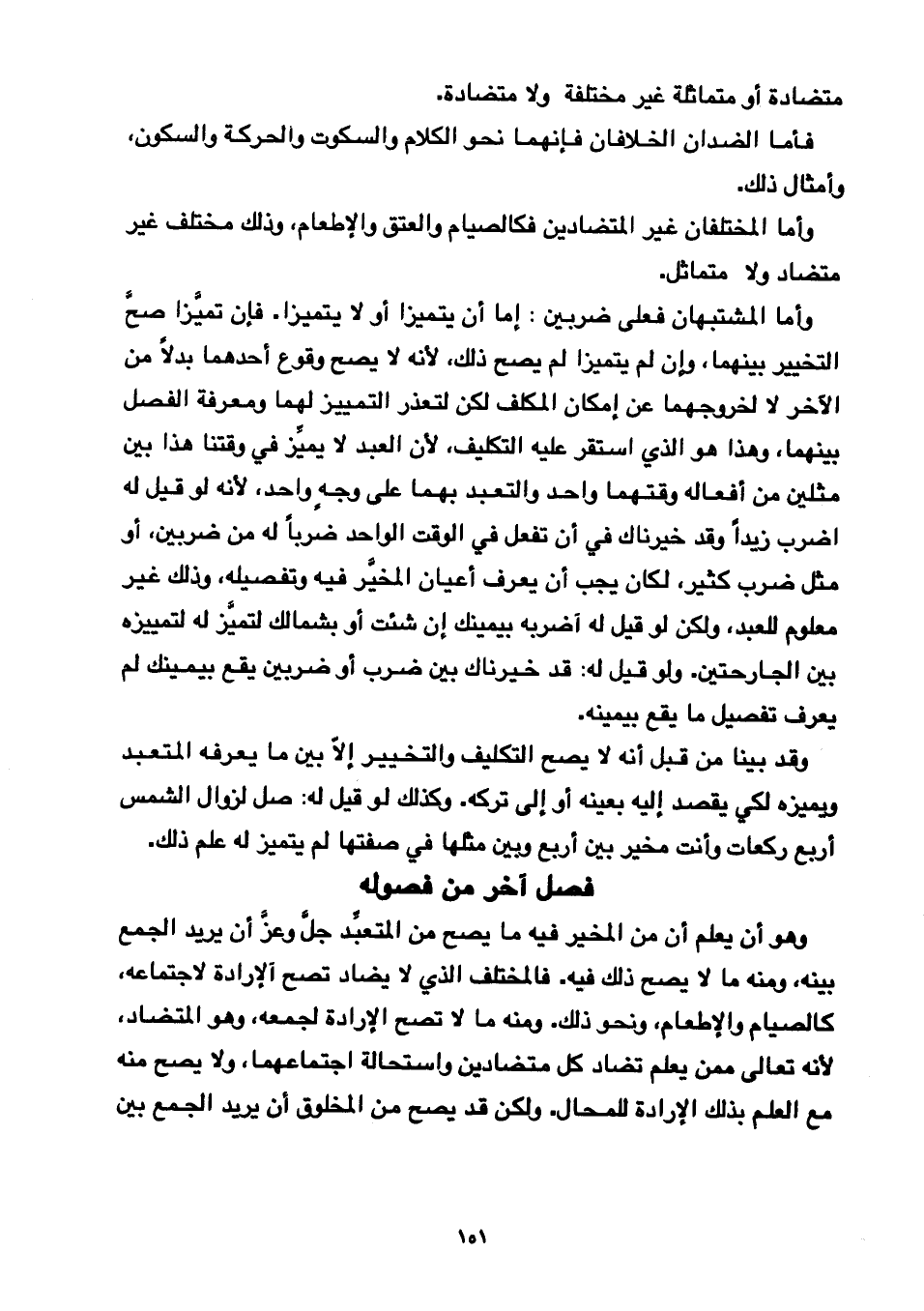 وهو أن يعلم أن من المخير فيه ما يصح من المتعبد جل وعز أن يريد الجمع بينه، ومنه ما لا يصح ذلك فيه. فالمختلف الذي لا يضاد تصح الإرادة لاجتماعه، كالصيام والإطعام، ونحو ذلك. ومنه ما لا تصح الإرادة لجمعه، وهو المتضاد، لله تعالى ممن يعلم تضاد كل متضادين واستحالة اجتماعهما، ولا يصح منه مع العلم بذلك الإرادة للمحال. ولكن قد يصح من المخلوق أن يريد الجمع بين