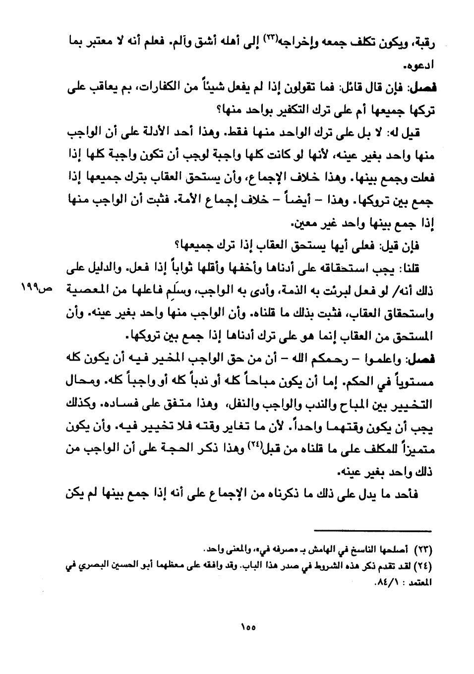 فصل: واعلموا - رحمكم الله- أن من حق الواجب المخير فيه أن يكون كله مستويا في الحكم. إما أن يكون مباحا كله أو ندبا كله أو واجبا كله. ومحال التخيير بين المباح والندب والواجب والنفل، وهذا متفق على فساده. وكذلك يجب أن يكون وقتهما واحدا. لأن ما تغاير وقته فلا تخيير فيه. وأن يكون متميزا للمكلف على ما قلناه من قبل وهذا ذكر الحجة على أن الواجب من ذلك واحد بغير عينه.