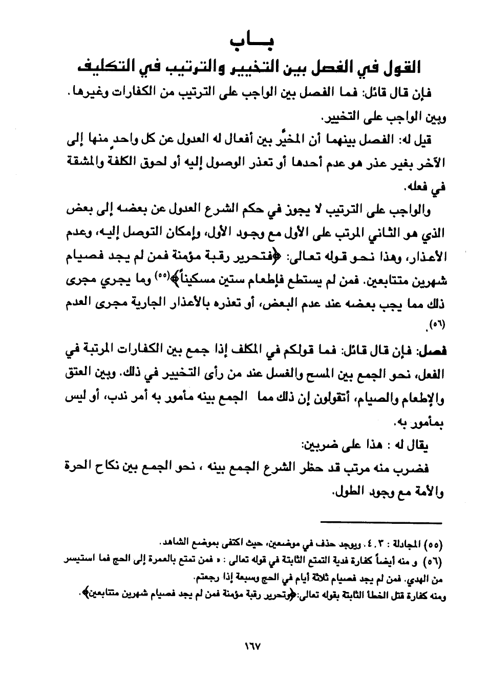 والواجب على الترتيب لا يجوز في حكم الشرع والعدول عن بعضه إلى بعض الذي هو الثاني المرتب على الأول مع وجود الأول, وإمكان التوصل إليه, وعدم الأعذار, وهذا نحو قوله تعالى: {فتَحْرِيرُ رَقَبَةٍ مُّؤْمِنَةٍ فَمَن لَّمْ يَجِدْ فَصِيَامُ شَهْرَيْنِ مُتَتَابِعَيْنِ. فَمَن لَّمْ يَسْتَطِعْ فَإطْعَامُ سِتِّينَ مِسْكِينًا} وما يجري مجرى ذلك مما يجب بعضه عند عدم البعض, أو تعذره بالأعذار الجارية مجرى العدم.