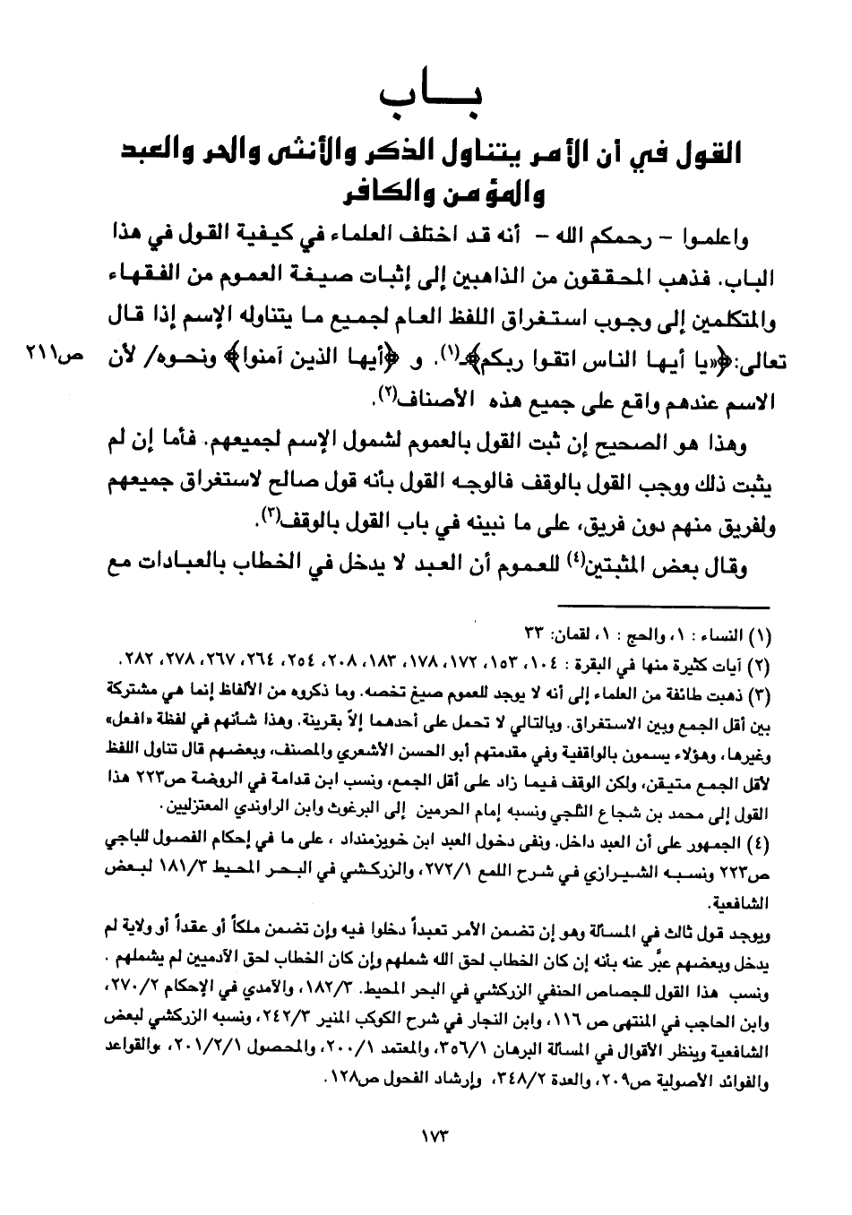 واعلموا- رحمكم الله- أنه قد اختلف العلماء في كيفية القول في هذا الباب. فذهب المحققون من الذاهبين إلى إثبات صيغة العموم من الفقهاء والمتكلمين إلى وجوب استغراق اللفظ العام لجميع ما يتناوله الاسم إذا قال تعالى: {يَا أَيُّهَا النَّاسُ اتَّقُوا رَبَّكُمْ} و {أَيُّهَا الَّذِينَ آمَنُوا} ونحوه ⦗٢١١⦘ لأن الاسم عندهم واقع على جميع هذه الأصناف.