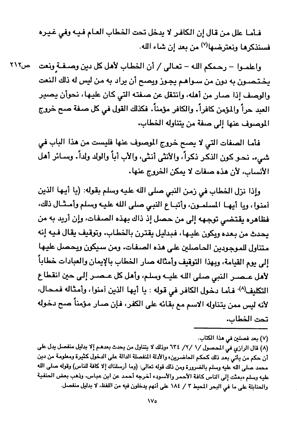 واعلموا- رحمكم الله- تعالى ⦗٢١٢⦘ أن الخطاب لأهل كل دين وصفة ونعت يختصون به دون من سواهم يجوز ويصح أن يراد به من ليس له ذلك النعت والوصف إذا صار من أهله, وانتقل عن صفته التي كان عليها, نحو أن يصير العبد حرا والمؤمن كافرا. والكافر مؤمنا. فكذلك القول في كل صفة صح خروج الموصوف عنها إلى صفة من يتناوله الخطاب.