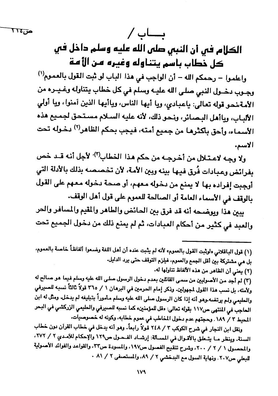 واعلموا- رحمكم الله- أن الواجب في هذا الباب لو ثبت القول بالعموم وجوب دخول النبي صلى الله عليه وسلم في كل خطاب يتناوله وغيره من الأمة, نحو قوله تعالى: يا عبادي, ويا أيها الناس, ويا أيها الذين آمنوا, ويا أولي الألباب, ويا أهل البصائر, ونحو ذلك, لأنه عليه السلام مستحق لجميع هذه الأسماء، وأحق بأكثرها من جميع أمته, فيجب بحكم الظاهر دخوله تحت الاسم.