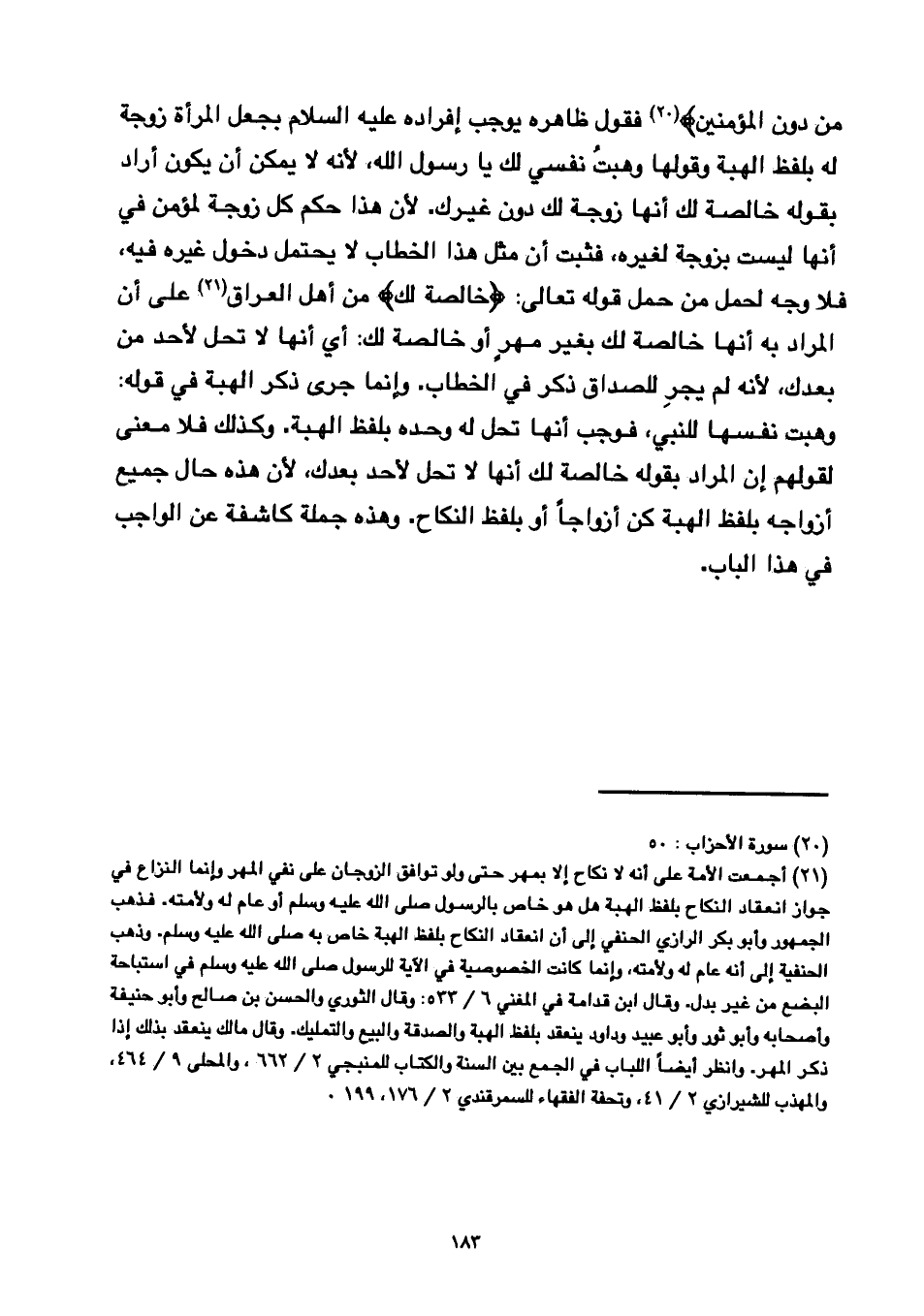 مِن دُونِ المُؤْمِنِينَ} فقول ظاهره يوجب إفراده عليه السلام بجعل المرأة زوجة له بلفظ الهبة وقولها وهبت نفسي لك يا رسول الله, لأنه لا يمكن أن يكون أراد بقوله خالصة لك أنها زوجة لك دون غيرك. لأن هذا حكم كل زوجة لمؤمن في أنها ليست بزوجة لغيره, فثبت أن مثل هذا الخطاب لا يحتمل دخول غيره فيه, فلا وجه لحمل من حمل قوله تعالى: {خَالِصَةً لَّكَ} من أهل العراق على أن المراد به أنها خالصة لك بغير مهر أو خالصة لك: أي أنها لا تحل لأحد من بعدك, لأنه لم يجر للصداق ذكر في الخطاب. وإنما جرى ذكر الهبة في قوله: وهبت نفسها للنبي, فوجب أنها تحل له وحده بلفظ الهبة. وكذلك فلا معنى لقولهم إن المراد بقوله خالصة لك أنها لا تحل لآحد بعدك, لأن هذه حال جميع أزواجه بلفظ الهبة كن أزواجا أو بلفظ النكاح. وهذه جملة كاشفة عن الواجب في هذا الباب.