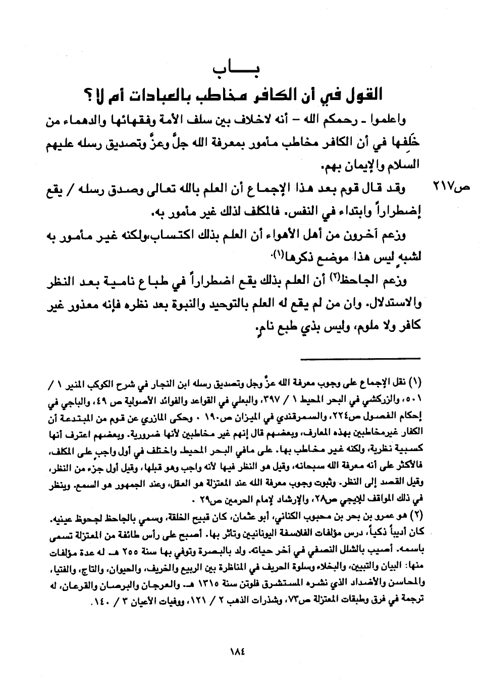 وزعم الجاحظ أن العلم بذلك يقع اضطرارا في طباع نامية بعد النظر والاستدلال. وان من لم يقع له العلم بالتوحيد والنبوة بعد نظره فإنه معذور غير كافر ولا ملوم, وليس بذي طبع نام.