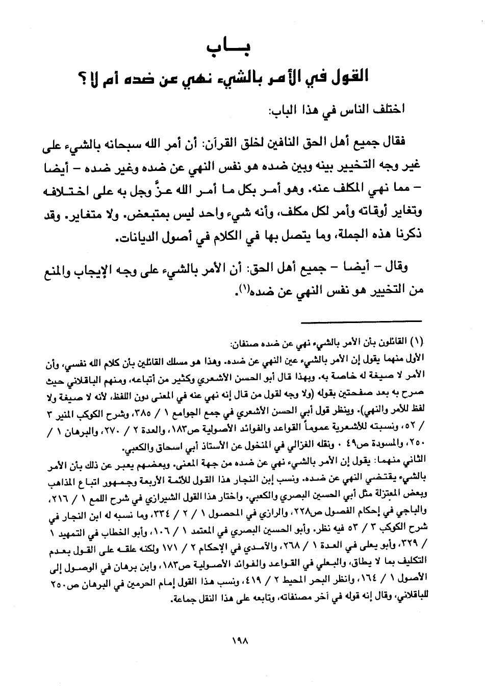 وقال- أيضا- جميع أهل الحق: أن الأمر بالشيء على وجه الإيجاب والمنع من التخيير هو نفس النهي عن ضده.