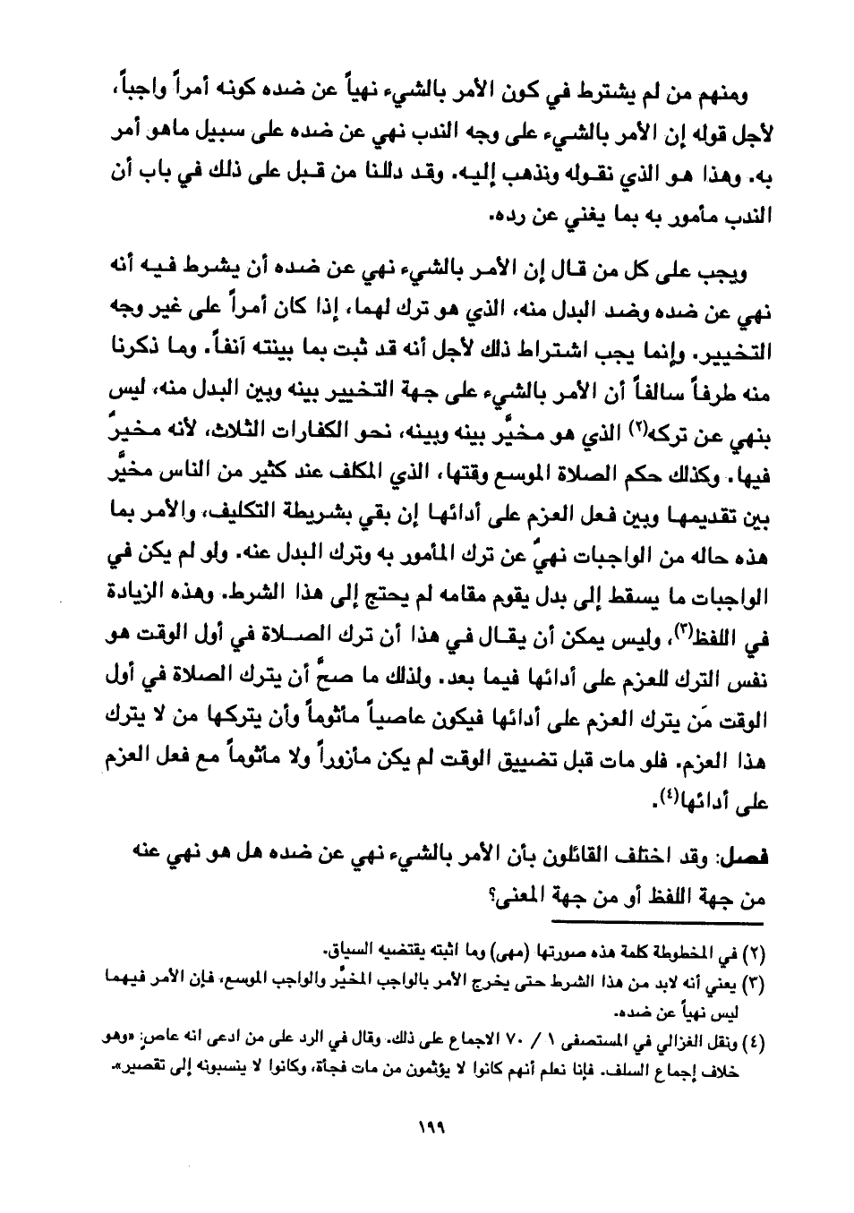 ويجب على كل من قال إن الأمر بالشيء نهي عن ضده أن يشترط فيه أنه نهي عن ضده وضد البدل منه, الذي هو ترك لهما, إذا كان أمرا على غير وجه التخيير. وأنما يجب اشتراط ذلك لأجل أنه قد ثبت بما بينته آنفا. وما ذكرنا منه طرفا سالفا أن الأمر بالشيء على جهة التخيير بينه وبين البدل منه, ليس بنهي عن تركه الذي هو مخير بينه وبينه, نحو الكفارات الثلاث, لأنه مخير فيها. وكذلك حكم الصلاة الموسع وقتها, الذي المكلف عند كثير من الناس مخير بين تقديمها وبين فعل العزم على أدائها إن بقي بشريطة التكليف, والأمر بما هذه حالة من الواجبات نهي عن ترك المأمور به وترك البدل عنه ولو لم يكن في الواجبات ما يسقط إلى بدل يقوم مقامه لم يحتج إلى هذا الشرط. وهذه الزيادة في اللفظ, وليس يمكن أيقال في هذا أن ترك الصلاة في أول الوقت هو نفس الترك للعزم على أدائها فيما بعد. ولذلك ما صح أن يترك الصلاة في أول الوقت من يترك العزم على أدائها فيكون عاصيا مأثوما وأن يتركها من لا يترك هذا العزم. فلو مات قبل تضييق الوقت لم يكن مأزروا ولا مأثوما مع فعل العزم على أدائها.