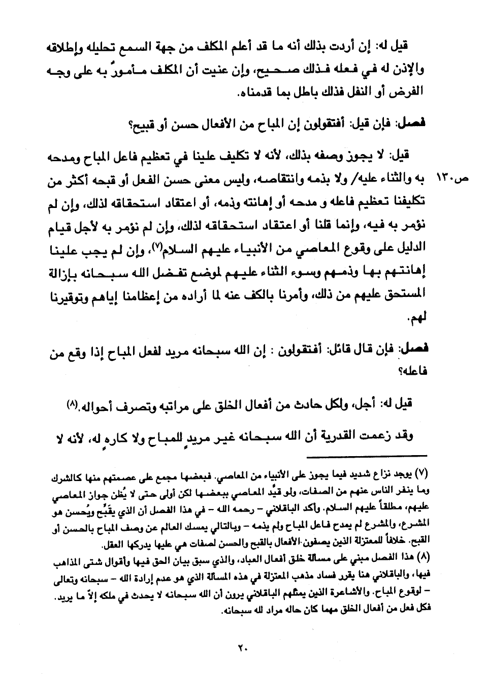 قيل: لا يجوز وصفة بذلك, لأنه لا تكليف علينا في تعظيم فاعل المباح ومدحه به والثناء عليه ⦗١٣⦘ ولا بذمه وانتقاصه, وليس معنى حسن الفعل أو قبحه أكثر من تكليفنا تعظيم فاعله ومدحه أو إهانته وذمه, أو اعتقاد استحقاقه لذلك, وإن لم نؤمر به فيه, وإنما قلنا أو اعتقاد استحقاقه لذلك, وإن لم نؤمر به لأجل قيام الدليل على وقوع المعاصي من الأنبياء عليهم السلام, وإن لم يجب علينا إهانتهم بها وذمهم وسوء الثناء عليهم لموضع تفضل الله سبحانه بإزالة المستحق عليهم من ذلك, وأمرنا بالكف عنه لما أراده من إعظامنا إياهم وتوقيرنا لهم.