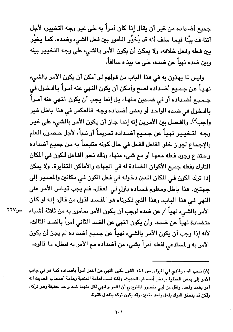 وليس لما يهذون به في هذا الباب من قولهم لو أمكن أن يكون الأمر بالشيء نهيا عن جميع أضداده لصح وأمكن أن يكون النهي عنه أمرا بالدخول في جميع أضداده أو في ضدين منها, بل إنما يجب أن يكون النهي عنه أمرا بالدخول في ضده الواحد أو بعض أضداده وجه, فالعكس في هذا باطل غير واجب. والفصل بين الأمرين إنه إنما جاز أن يكون الأمر بالشيء على غير وجه التخيير نهيا عن جميع أضداده نحريما أو ندبا, لأجل حصول العلم بالإجماع لجواز خلو الفاعل للفعل في حال كونه متلبسا به من جميع أضداده وامتناع وجود فعله معها أو مع شيء منها, وذلك نحو الفاعل للكون في المكان التارك بفعله جميع الأكوان المضادة له في الجهات والأماكن المتغايرة. ولا يمكن إذا ترك الكون في المكان المعين دخوله في فعل الكون في مكانين والمصير إلى جهتين. هذا باطل ومعلوم فساده بأول في العقل. فلم يجب قياس الأمر على النهي في هذا الباب. وهذا الذي ذكرناه هو المفسد لقول من قال: إنه لو كان الأمر بالشيء نهيا ⦗٢٢٧⦘ عن ضده لوجب أن يكون الأمر بمأمور به من ثلاث أضياء متضادة نهيا عن ضده. وأن يكون النهي عن الضد الثاني أمرا بالضد الثالث, لأنه إذا وجب أن يكون الأمر بالشيء نهيا عن جميع أضداده لم يجز أن يكون الآمر به والمستدعي أمرا بشيء من أضداده مع الأمر به فبطل، ما قالوه.