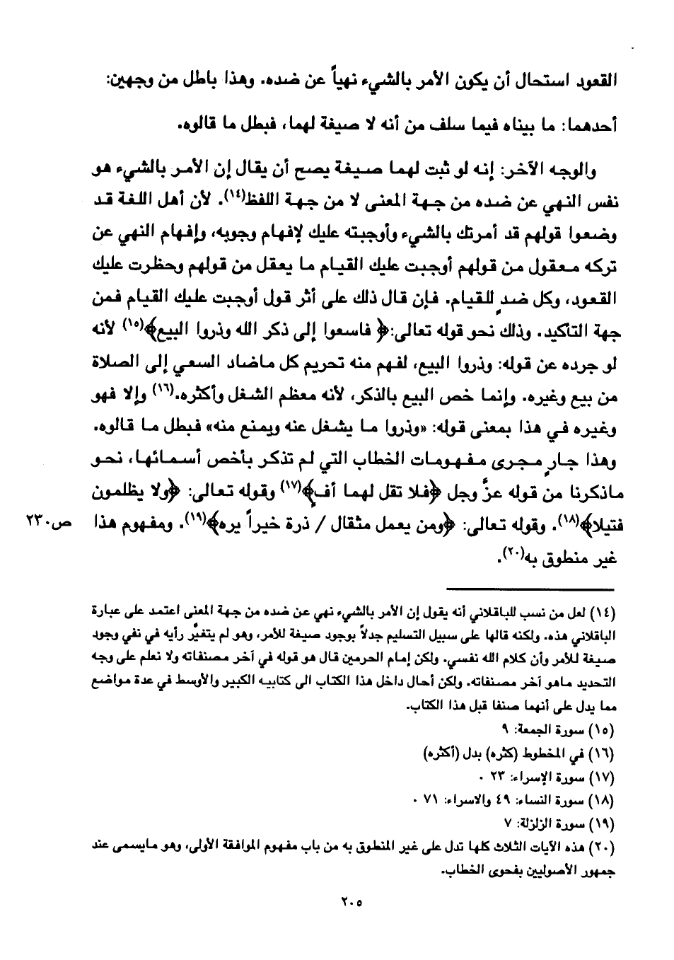 والوجه الآخر: إنه لوثبت لهما صيغة يصح أن يقال إن الأمر بالشيء هو نفس النهي عن ضده من جهة المعنى لا من جهة اللفظ. لأن أهل اللغة قد وضعوا قولهم قد أمرتك بالشيء وأوجبته عليك لإفهام وجوبه, وإفهام النهي عن تركه معقول من قولهم أوجبت عليك القيام ما يعقل من قولهم وحظرت عليك القعود, وكل ضد للقيام. فإن قال ذلك على أثر قول أوجبت عليك القيام فمن جهة التأكيد. وذلك نحو قوله تعالى: {فَاسْعَوْا إلَى ذِكْرِ اللَّهِ وذَرُوا البَيْعَ} لأنه لو جرده عن قوله: وذروا البيع، لفهم منه تحريم كل ما ضاد السعي إلى الصلاة من بيع وغيره. وإنما خص البيع بالذكر، لأنه معظم الشغل وأكثره. وإلا فهو وغيره في هذا بمعنى قوله:" وذروا ما يشغل عنه ويمنع منه" فبطل ما قالوه.
