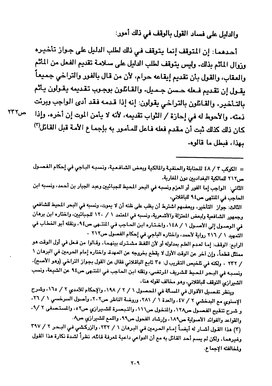 أحدهما: إن المتوقف إنما يتوقف في ذلك لطلب الدليل على جواز تأخيره وزوال المأثم بذلك. وليس يتوقف لطلب الدليل على سلامة تقديم الفعل من المأثم والعقاب, والقول بأن تقديم إيقاعه حرام, لأن من قال بالفور والتراخي جميعا يقول إن تقديم فعله حسن جميل. والقائلون بوجوب تقديمه يقولون يأثم بالتأخير. والقائلون بالتراخي يقولون: إنه إذا قدمه فقد أدى الواجب وبرئت ذمته. والأحوط له في إحازة ⦗٢٣٢⦘ الثواب تقديمه, لأنه لا يأمن الموت إن أخره. وإذا كان ذلك ثبت أن مقدم فعله فاعل للمأمور به بإجماع الأمة قبل القائل بهذا, فبطل ما قالوه.