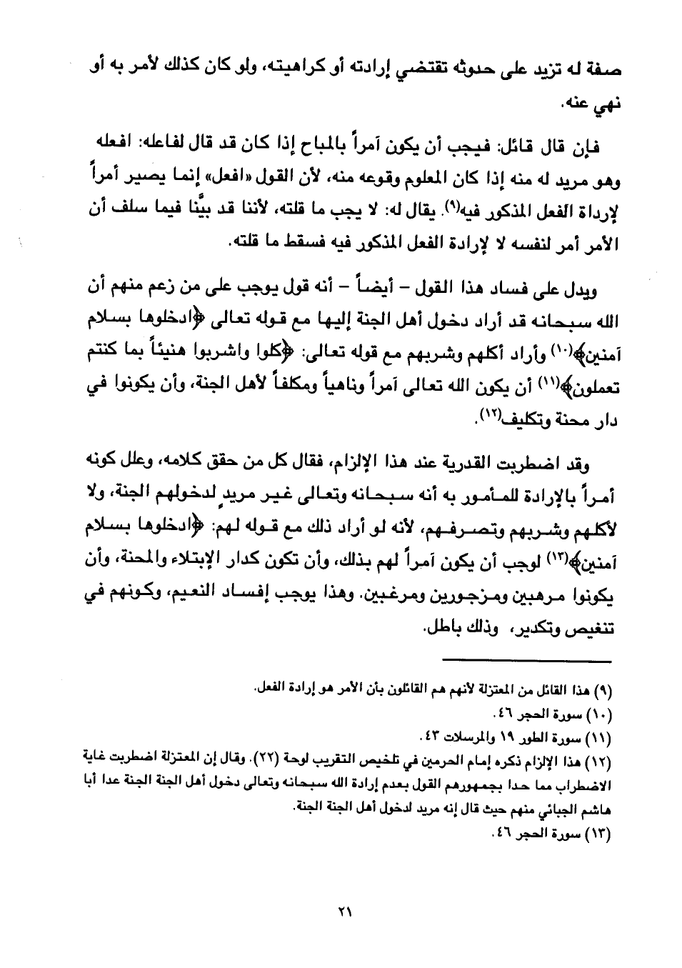 ويدل على فساد هذا القول- أيضا- أنه قول يوجب على من زعم منهم أن الله سبحانه وقد أراد أهل الجنة إليها مع قوله تعالى {ادْخُلُوهَا بِسَلامٍ آمِنِينَ} وأراد أكلهم وشربهم مع قوله تعالى: {كُلُوا واشْرَبُوا هَنِيئًا بِمَا كُنتُمْ تَعْمَلُونَ} أن يكون الله تعالى آمرا وناهيا ومكلفا لأهل الجنة, وأن يكونوا في داغر محنة وتكليف.