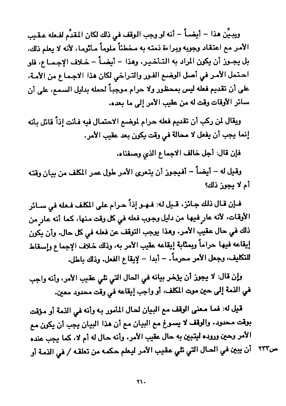 ويبين هذا- أيضا- أنه لو وجب الوقف في ذلك لكان المقدم لفعله عقيب الأمر مع اعتقاد وجوبه وبراءة ذمته به مخطئا ملوما مأثوما, لأنه لا يعلم ذلك بل يجوز أن يكون المراد به به التأخير. وهذا- أيضا- خلاف الإجماع فلو احتمل الأمر في أصل الوضع الفور والتراخي لكان هذا الإجماع من الأمة, على أن تقديم فعله ليس بمحظور ولا حرام موجبا لحمله بدليل السمع, على أن سائر الأوقات وقت له من عقيب الأمر إلى ما بعده.