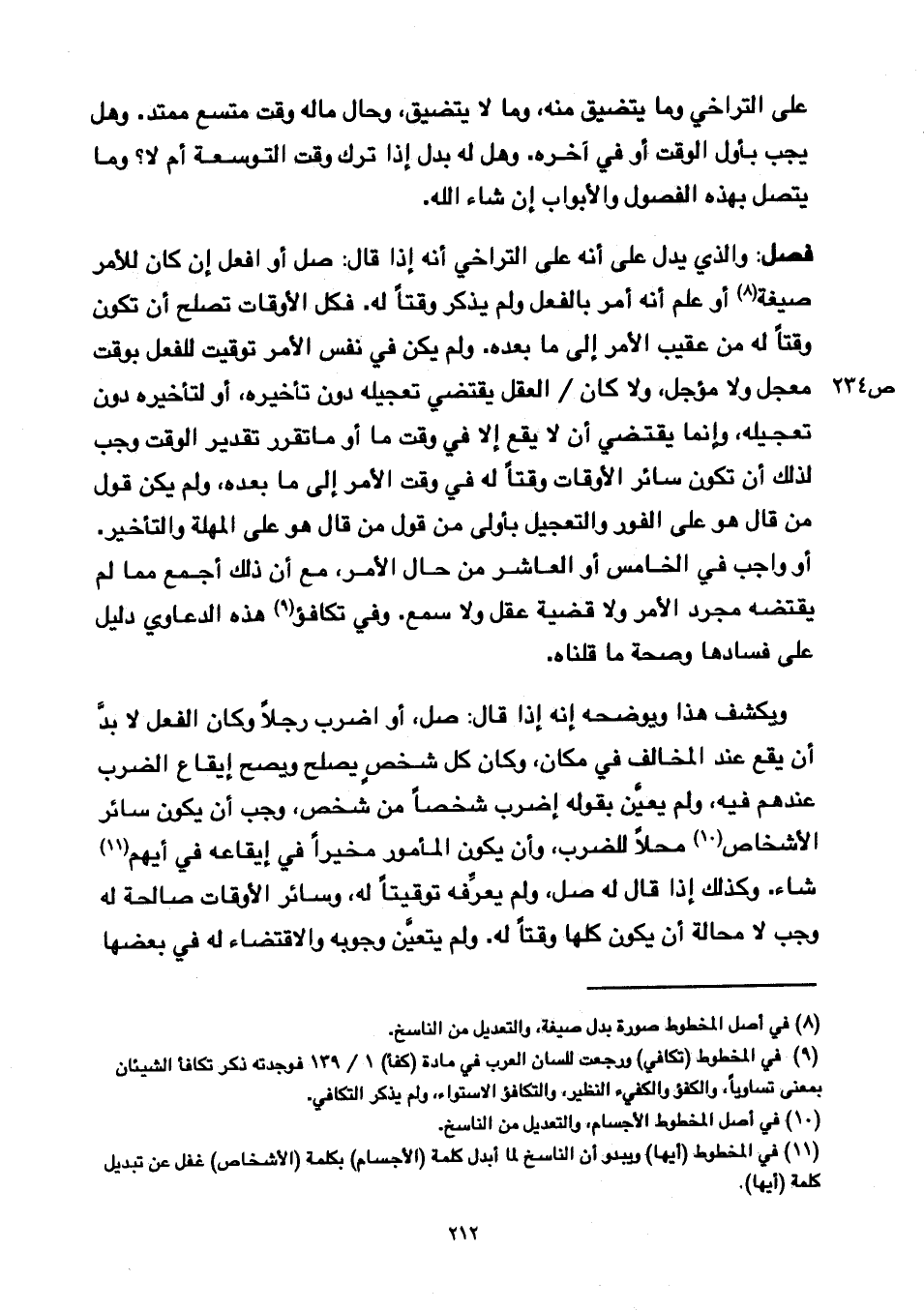 فصل: والذي يدل على أنه على التراخي أنه إذا قال: صل أو افعل إن كان للأمر صيغة أو علم أنه أمر بالفعل ولم يذكر وقتاً له. فكل الأوقات تصلح أن تكون وقتاً له من عقيب الأمر إلى ما بعده. ولم يكن في نفس الأمر توقيت للفعل بوقت معجل ولا مؤجل، ولا كان /ص ٢٣٤ العقل يقتضي تعجيله دون تأخيره، أو لتأخيره دون تعجيله، وإنما يقتضي أن لا يقع إلا في وقت ما أو ما تقرر تقدير الوقت وجب لذلك أن تكون سائر الأوقات وقتاً له في دقت الأمر إلى ما بعدمه ولم يكن قول من قال هو على الفور والتعجيل بأولي من قول من قال هو على المهلة والتأخير. أو واجب قي الخامس أو العاشر من حال الأمر، مع أن ذلك أجمع مما لم يقتضه مجرد الأمر ولا قضية عقل ولا سمع. وفي تكافؤ هذه الدعاوي دليل على فسادها وصحة ما قلناه.