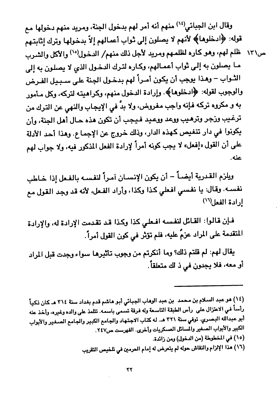 وقال ابن الجبائي منهم أنه أمر لهم بدخول الجنة, ومريد منهم دخولها مع قوله: {ادْخُلُوهَا} لأنهم لا يصلون إلى ثواب أعمالهم إلا بدخولها وترك إثابتهم ظلم لهم, وهو كاره لظلمهم ومريد لأجل ذلك منهم ⦗١٢⦘ الدخول والأكل والشرب ما يصلون به إلى ثواب أعمالهم, وكاره لترك الدخول الذي لا يصلون به إلى الثواب- وهذا يوجب أن يكون أمرا لهم بدخول الجنة على سبيل الفرض والوجوب لقوله: {ادْخُلُوهَا}. وإرادة الدخول منهم, وكراهيته لتركه, وكل مأمور به ومكروه تركه فإنه واجب مفروض, ولا بد في الإيجاب والنهي عن الترك من ترغيب وزجر وترهيب ووعد ووعيد فيجب أن تكون هذه حال أهل الجنة, وأن يكونوا في دار تنغيص كهذه الدار, وذلك خروج عن الإجماع. وهذا أحد الأدلة على أن القول "إفعل" لا يجب كونه أمر لإرادة الفعل المذكور فيه, ولا جواب لهم عنه.