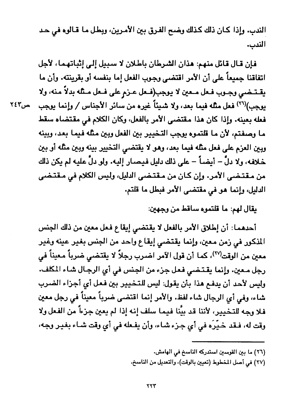 فإن قال قائل منهم: هذان الشرطان باطلان لا سبيل إلى إثباتهما، لأجل اتفاقنا جميعاً على أن الأمر اقتضى وجوب الفعل إما بنفسه أو بقرينته. وإن ما يقتضي وجوب فعل معين لا يوجب (فعل عزم على فعل مثله بدلاً منه، ولا يوجب) فعل مثله فيما بعد، ولا. شيئاً غيره من سائر الأجناس/ ص ٢٣٤ وإنما يوجب فعله بعينه. وإذا كان هذا مقتضى الأمر بالفعل، وكان الكلام في مقتضاه سقط ما وصفتم، لأن ما قلتموه يوجب التخيير بين الفعل وبين مثله فيما بعد، وبينه وبين العزم على فعل مثله فيما بعده، وهو لا يقتضي التخيير بينه وبين مثله أو بين خلافه، ولا دل - أيضا - على ذلك دليل فيصار إليه. ولو دل عليه لم يكن ذلك من مقتضى الأمر. وإن كان من مقتضى الدليل، وليس الكلام قي مقتضى الدليل، وإنما هو في مقتضى الأمر فبطل ما قلتم.