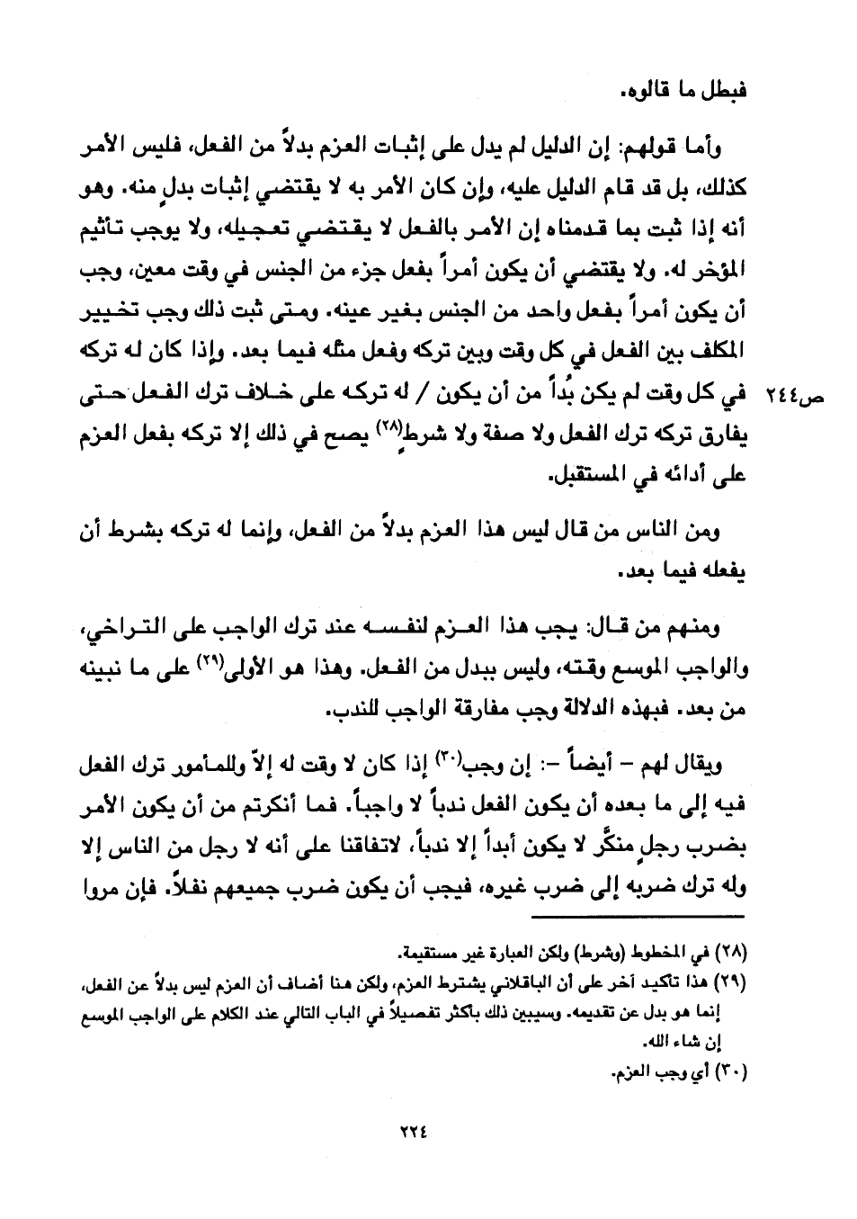وأما قولهم: إن الدليل لم يدل على إثبات العزم بدلاً من الفعل، فليس الأمر كذلك، بل قد قام الدليل عليه، وإن كان الأمر به لا يقتضي إثبات بدل منه. وهو أنه إذا ثبت بما قدمناه إن الأمر بالفعل لا يقتضي تعجيله، ولا يوجب تأثيم المؤخر له. ولا يقتضي أن يكون أمراً بفعل جزء من الجنس في وقت معين، وجب أن يكون أمراً بفل واحد من الجنس بغير عينه. ومتى ثبت ذلك وجب تخيير المكلف بين الفعل في كل وقت وبين تركه وفعل مثله فيما بعد. وإذا كان له تركه في كل وقت لم يكن بدا من أن يكون/ ص ٢٤٤ له تركه على خلاف ترك الفعل حتى يفارق تركه ترك الفعل ولا صفة ولا شرط يصح في ذلك إلا تركه بفعل العزم على أدائه قي المستقبل.