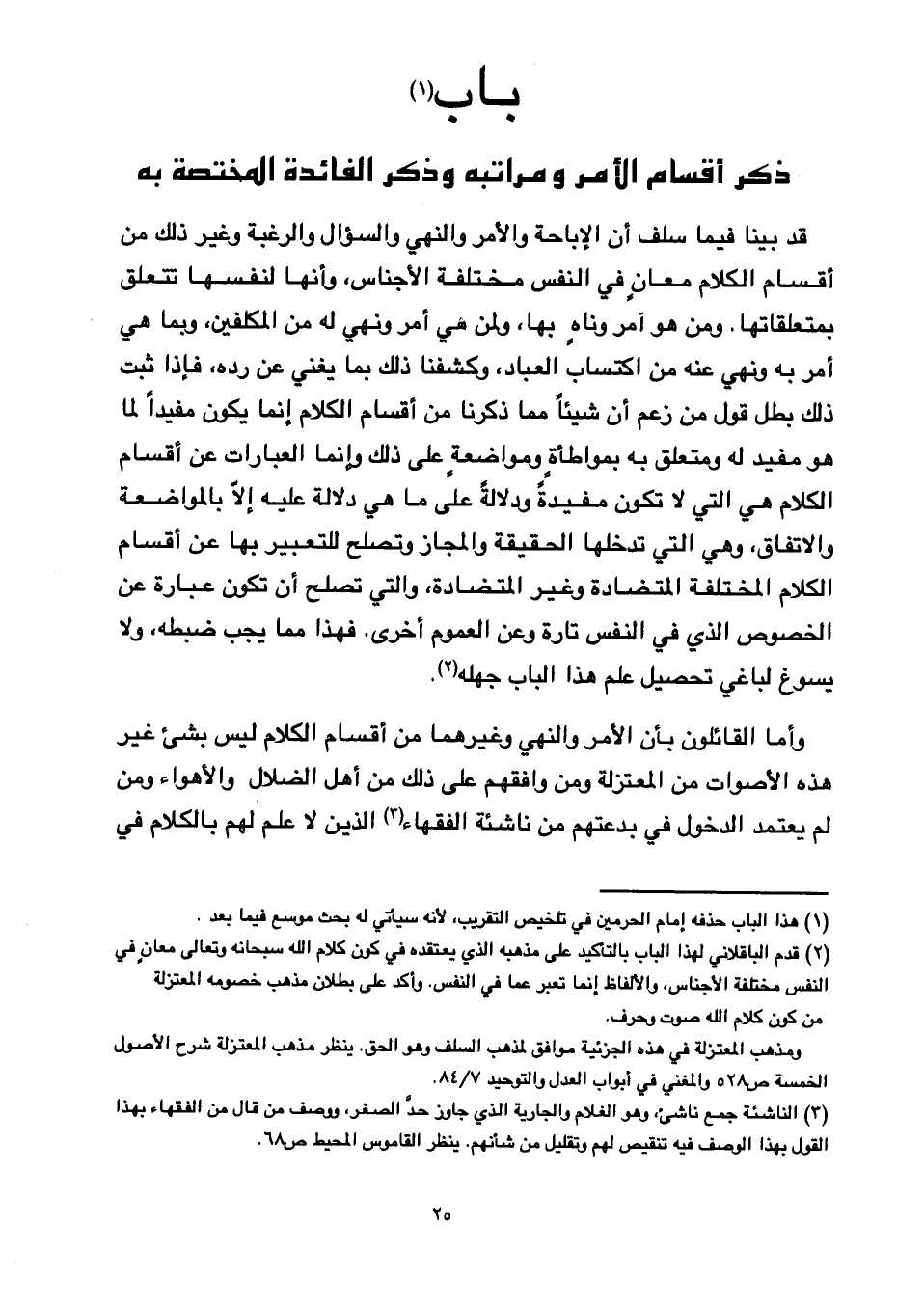 وأما القائلون بأن الأمر والنهي وغيرهما من أقسام الكلام ليس بشيء غير هذه الأصوات من المعتزلة ومن وافقهم على ذلك من أهل الضلال والأهواء ومن لم يعتمد الدخول في بدعتهم من ناشئة الفقهاء الذين لا علم لهم بالكلام في