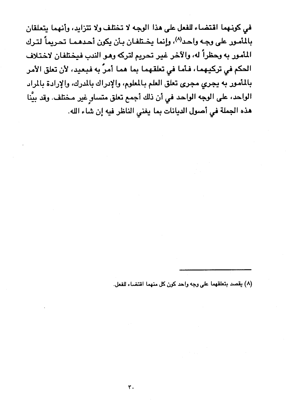 في كونهما اقتضاء للفعل على هـ ٩ ذا الوجه لا تختلف ولا تتزايد, وأنهما يتعلقان بالمأمور على وجه واحد, وإنما يختلفان بأن يكون أحدهما تحريما لترك المأمور به وحظرا له, والآخر غير تحريم لتركه وهو الندب فيختلفان لاختلاف الحكم في تركيهما, فأما في تعلقهما بما هما أمر به فبعيد, لأن تعلق الأمر بالمأمور به يجري مجرى تعلق العلم بالمعلوم, والإدراك بالمدرك, والإرادة بالمراد الواحد, على الوجه الواحد في أن ذلك أجمع تعلق متساو غير مختلف. وقد بينا هذه الجملة في أصول الديانات بما يغني الناظر فيه إن شاء الله.