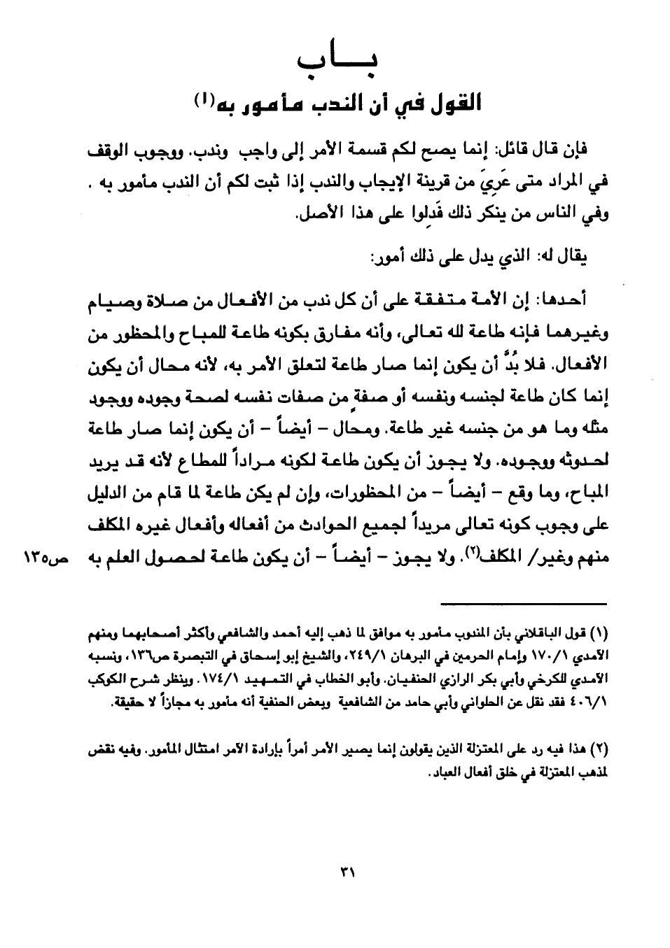أحدها: إن الأمة متفقة على أن كل ندب من الأفعال من صلاة وصيام وغيرهما فإنه طاعة لله تعالى, وأنه مفارق بكونه طاعة للمباح والمحظور من الأفعال, فلابد أن يكون إنما صار طاعة لتعلق الأمر به, لأنه محال أن يكون إنما كان طاعة لجنسه ونفسه أو صفة من صفات نفسه لصحة وجوده ووجود مثله وما هو من جنسه غير طاعة, ومحال - أيضًا - أن يكون إنما صار طاعة لحدوثه ووجوده, ولا يجوز أن يكون طاعة لكونه مرادًا للمطاع لأنه قد يريد على المباح, وما وقع - أيضًا - من المحظورات, وإن لم يكن طاعة لما قام من الدليل على وجوب كونه تعالى مريدًا لجميع الحوادث من أفعاله وأفعال غيره/ ص ١٣٥ المكلف منهم وغير المكلف, ولا يجوز - أيضًا - أن يكون طاعة لحصول العلم به