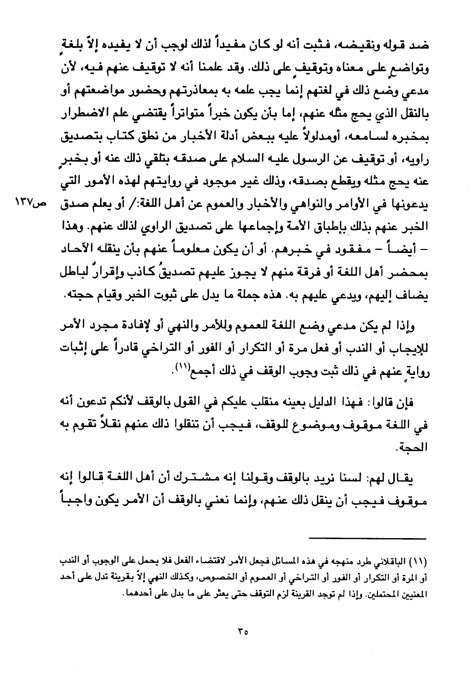 وإذا لم يكن مدعي وضع اللغة للعموم وللأمر والنهي أو لإفادة مجرد الأمر للإيجاب أو الندب أو فعل مرة أو التكرار أو الفور أو التراخي قادرًا على إثبات رواية عنهم في ذلك ثبت وجوب الوقف في ذلك أجمع.