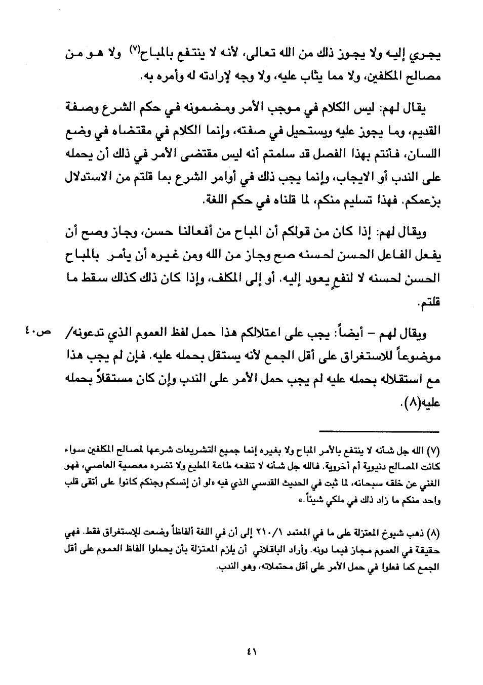 ويقال لهم - أيضًا: يجب على اعتلالكم هذا حمل لفظ العموم الذي تدعونه / ص ١٤٠ موضوعًا للاستغراق على أقل الجمع لأنه يستقل بحمله عليه, فإن لم يجب هذا مع استقلاله بحمله عليه لم يجب حمل الأمر على الندب وإن كان مستقلًا بحمله عليه.