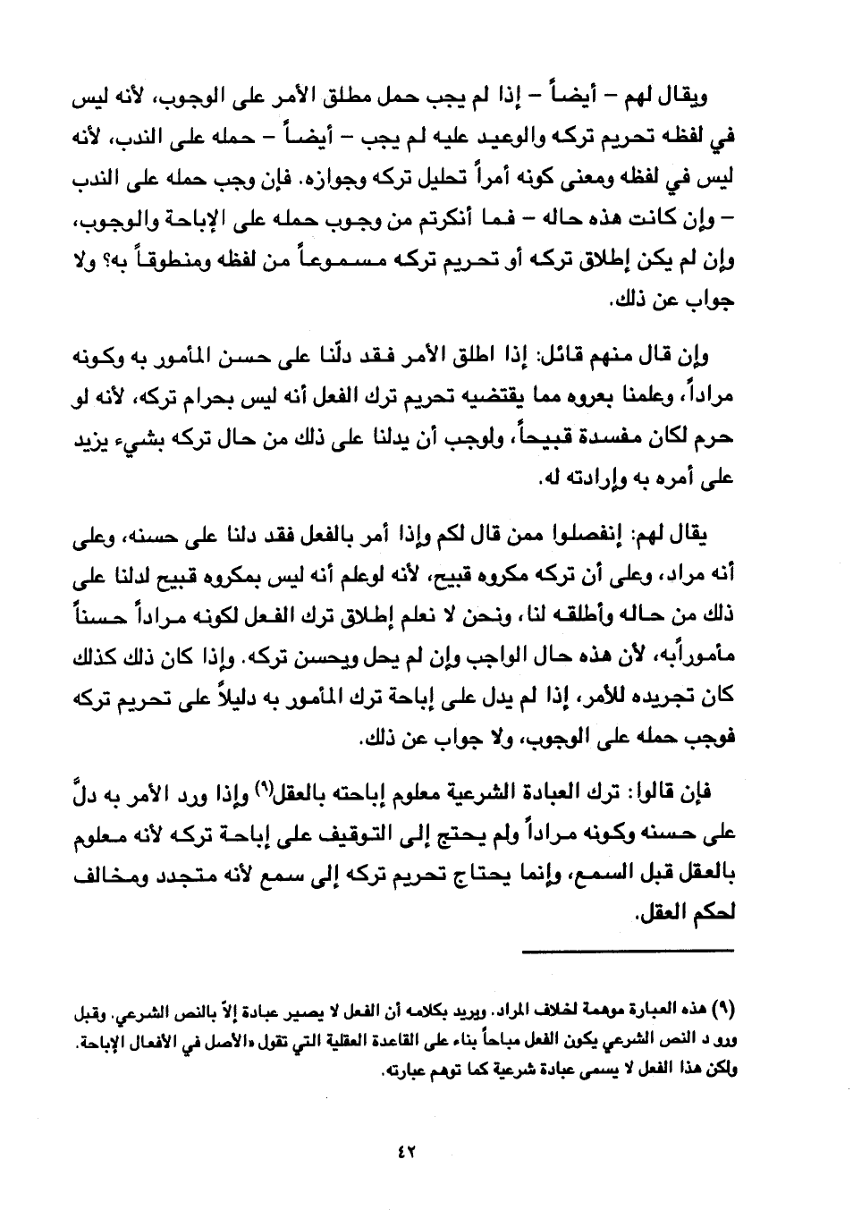 فإن قالوا: ترك العبادة الشرعية معلوم إباحته بالعقل وإذا ورد الأمر به دل على حسنه وكونه مرادًا ولم يحتج إلى التوقيف على إباحة تركه لأنه معلوم بالعقل قبل السمع, وإنما يحتاج تحريم تركه إلى سمع لأنه متجدد ومخالف لحكم العقل.