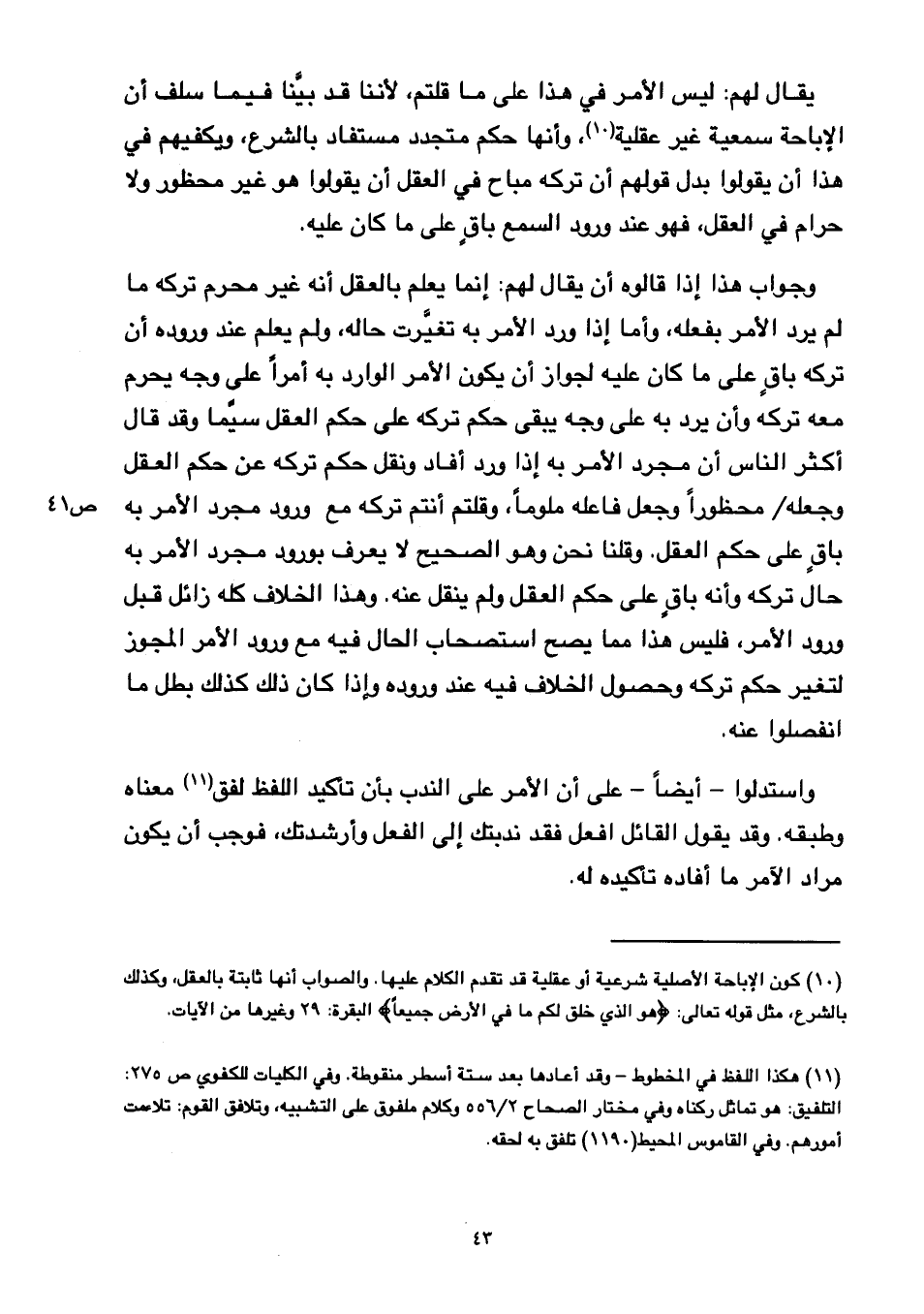 وجواب هذا إذا قالوه أن يقال لهم: إنما يعلم بالعقل أنه غير محرم تركه ما لم يرد الأمر بفعله, وأما إذا ورد الأمر به تغيرت حاله, ولم يعلم عند وروده أن تركه باق على ما كان عليه لجواز أن يكون الأمر الوارد به أمرًا على وجه يحرم معه تركه وأن يرد به على وجه يبقى حكم تركه على حكم العقل سيما وقد قال أكثر الناس أن مجرد الأمر به إذا ورد أفاد ونقل حكم تركه عن حكم العقل وجعله/ ص ٤١ محظورًا وجعل فاعله ملومًا, وقلتم أنتم تركه مع ورود مجرد الأمر به باق على حكم العقل, وقلنا نحن وهو الصحيح لا يعرف بورود مجرد الأمر به حال تركه وأنه باق على حكم العقل ولم ينقل عنه, وهذا الخلاف كله زائل قبل ورود الأمر, فليس هذا مما يصح استصحاب الحال فيه مع ورود الأمر المجوز لتغير حكم تركه وحصول الخلاف فيه عند وروده وإذا كان ذلك كذلك بطل ما انفصلوا عنه.