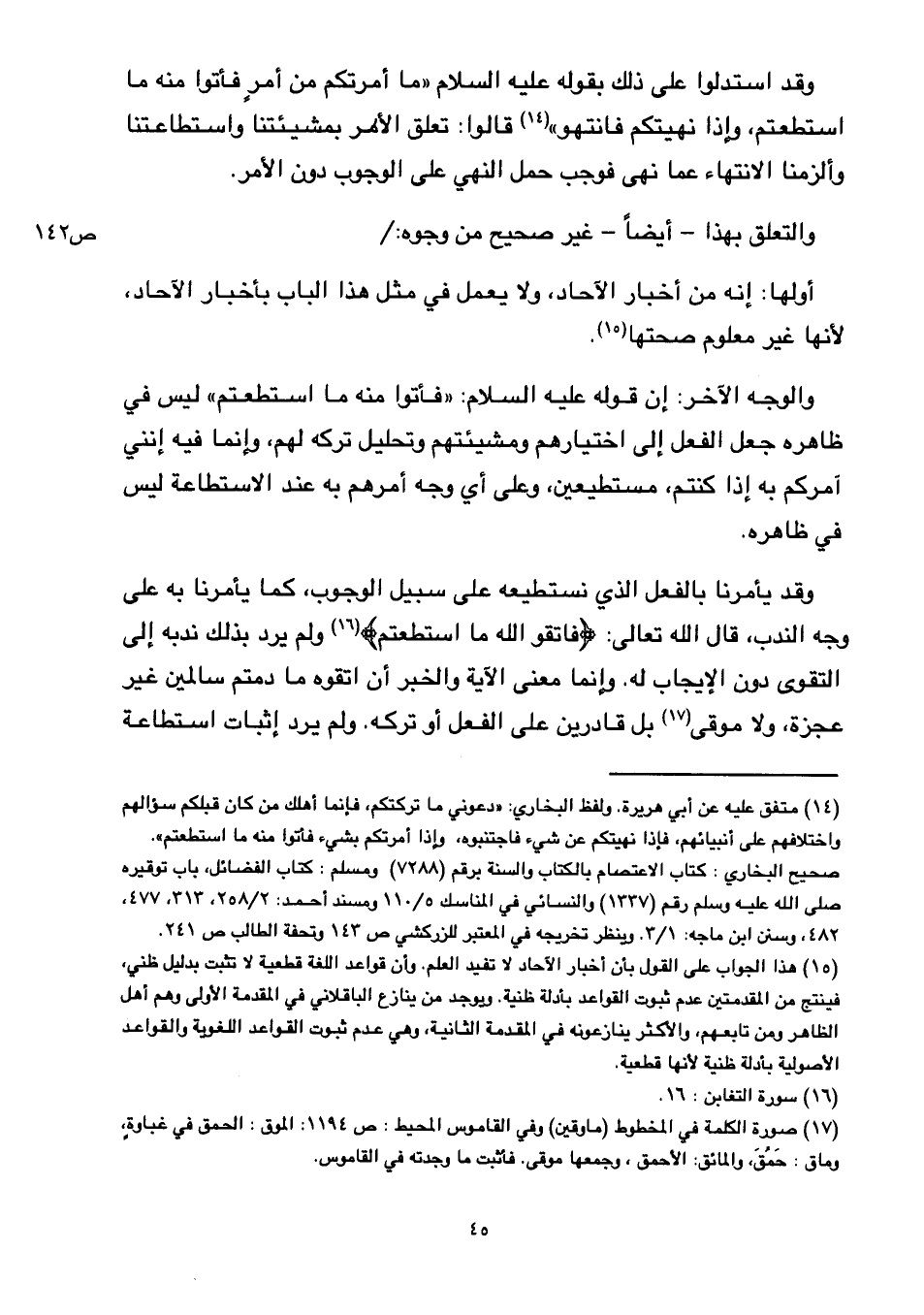 والوجه الآخر: إن قوله عليه السلام: "فأتوا منه ما استطعتم" ليس في ظاهره جعل الفعل إلى اختيارهم ومشيئتهم وتحليل تركه لهم, وإنما فيه إنني آمركم به إذا كنتم, وعلى أي وجه أمرهم به عند الاستطاعة ليس في ظاهره.