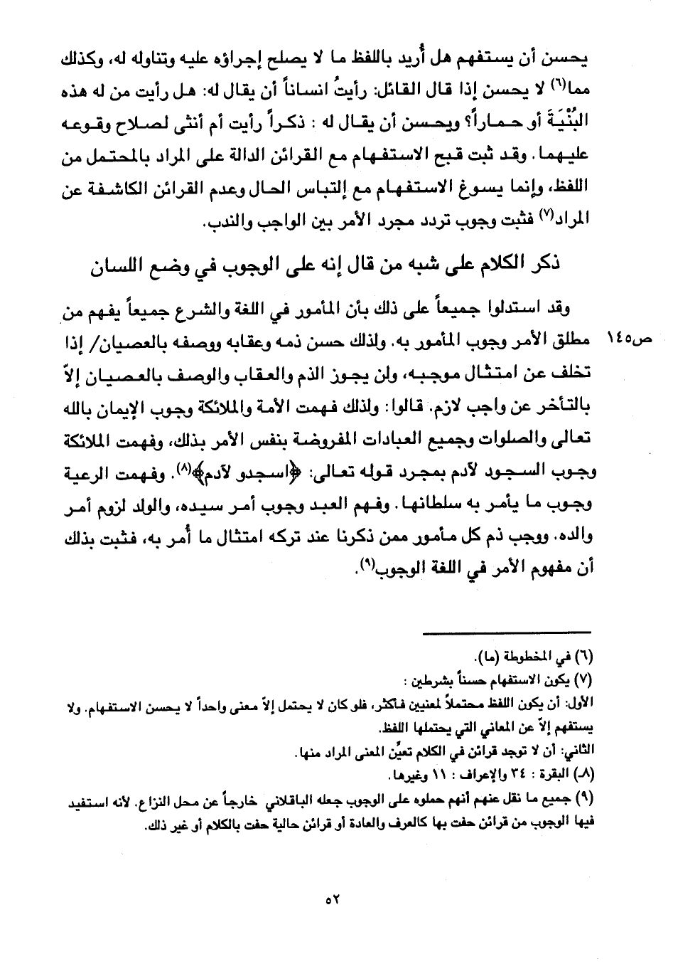 ذكر الكلام على شبه من قال إنه على الوجوب في وضع اللسان وقد استدلوا جميعًا على ذلك بأن المأمور في اللغة والشرع جميعًا يفهم من مطلق الأمر وجوب المأمور به, ولذلك حسن ذمه وعقابه ووصفه بالعصيان/ ص ١٤٥ إذا تخلف عن امتثال موجبه, ولن يجوز الذم والعقاب والوصف بالعصيان إلا بالتأخر عن واجب لازم, قالوا: ولذلك فهمت الأمة والملائكة وجوب الإيمان بالله تعالى والصلوات وجميع العبادات المفروضة بنفس الأمر بذلك, وفهمت الملائكة وجوب السجود لآدم بمجرد قوله {اسْجُدُوا لِآدَمَ}، وفهمت الرعية وجوب ما يأمر به سلطانها, وفهم العبد وجوب أمر سيده, والولد لزوم أمر والده, ووجب ذم كل مأمور ممن ذكرنا عند تركه امتثال ما أمر به, فثبت بذلك أن مفهوم الأمر في اللغة الوجوب.