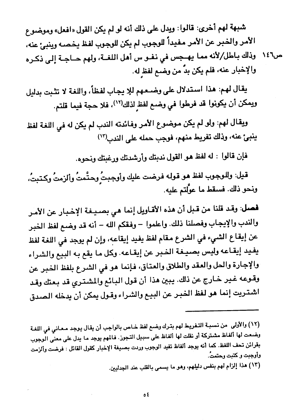 شبهة لهم أخرى: قالوا: ويدل على ذلك أنه لو لم يكن القول "افعل" وموضوع الأمر والخبر عن الأمر مفيدًا للوجوب لم يكن للوجوب لفظ يخصه وينبئ عنه, وذلك باطل/ ص ١٤٦ لأنه مما يهجس في نفوس أهل اللغة, ولهم حاجة إلى ذكره والإخبار عنه, فلم يكن بد من وضع لفظ له.