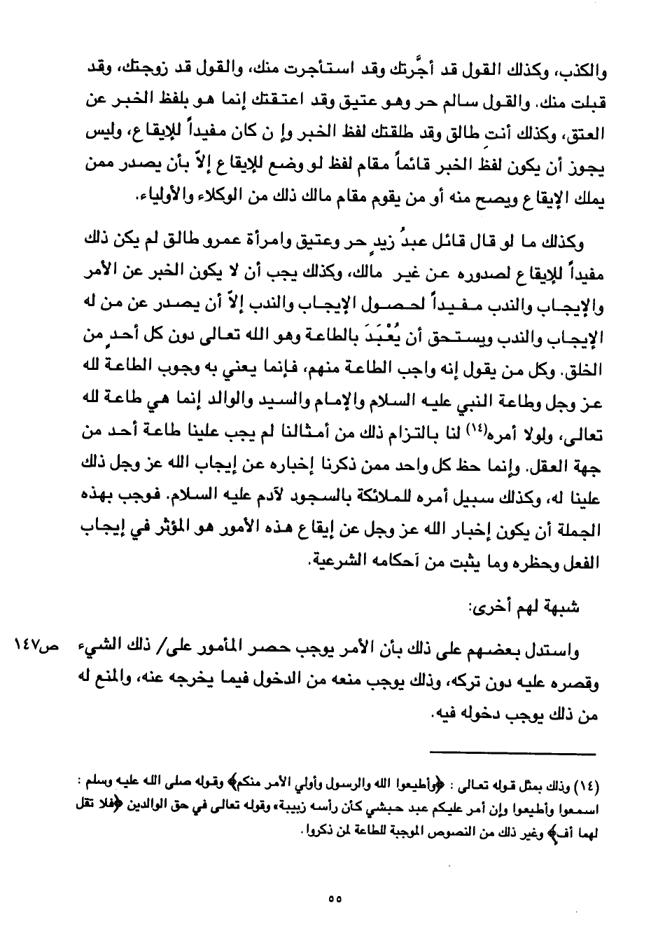 وكذلك ما لو قال قائل عبد زيد حر وعتيق وامرأة عمرو طالق لم يكن ذلك مفيدًا للإيقاع لصدوره عن غير مالك, وكذلك يجب أن لا يكون الخبر عن الأمر والإيجاب والندب مفيدًا لحصول الإيجاب والندب إلا أن يصدر عن من له الإيجاب والندب ويستحق أن يعبد بالطاعة وهو الله تعالى دون كل أحد من الخلق, وكل من يقول إنه واجب الطاعة منهم, فإنما يعني به وجوب الطاعة لله عز وجل وطاعة النبي عليه السلام والإمام والسيد والوالد إنما هي طاعة لله تعالى, ولولا أمره لنا بالتزام ذلك من أمثالنا لم يجب علينا طاعة أحد من جهة العقل, وإنما حظ كل واحد ممن ذكرنا إخباره عن إيجاب الله عز وجل ذلك علينا له, وكذلك سبيل أمره للملائكة بالسجود لآدم عليه السلام, فوجب بهذه الجملة أن يكون إخبار الله عز وجل عن إيقاع هذه الأمور هو المؤثر في إيجاب الفعل وحظره وما يثبت من أحكامه الشرعية.