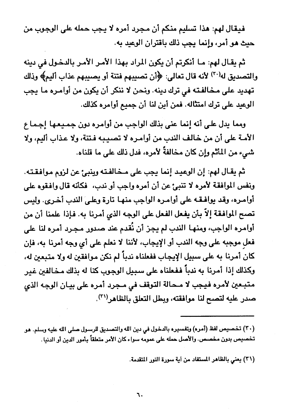 ثم يقال لهم: ما أنكرتم أن يكون المراد بهذا الأمر بالدخول في دينه والتصديق له لأنه قال تعالى: {أنْ تُصِيبَهُمْ فِتْنَةٌ أَوْ يُصِيبَهُمْ عَذَابٌ أَلِيمٌ} وذلك تهديد على مخالفته في ترك دينه, ونحن لا ننكر أن يكون من أوامره ما يجب الوعيد على ترك امتثاله, فمن أين لنا أن جميع أوامره كذلك.