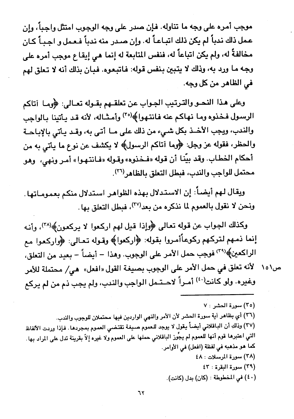 وكذلك الجواب عن قوله تعالى {وَإِذَا قِيلَ لَهُمُ ارْكَعُوا لَا يَرْكَعُونَ} , وأنه إنما ذمهم لتركهم ركوعًا أمروا بقوله: {ارْكَعُوا} وقوله تعالى {وَارْكَعُوا مَعَ الرَّاكِعِينَ} فوجب حمل الأمر على الوجوب, وهذا - أيضًا - بعيد من التعلق, لأنه تعلق في حمل الأمر على الوجوب بصيغة القول "افعل" هي محتملة للأمر وغيره, ولو كانت أمرًا لاحتمل الواجب والندب, ولم يجب ذم من لم يركع