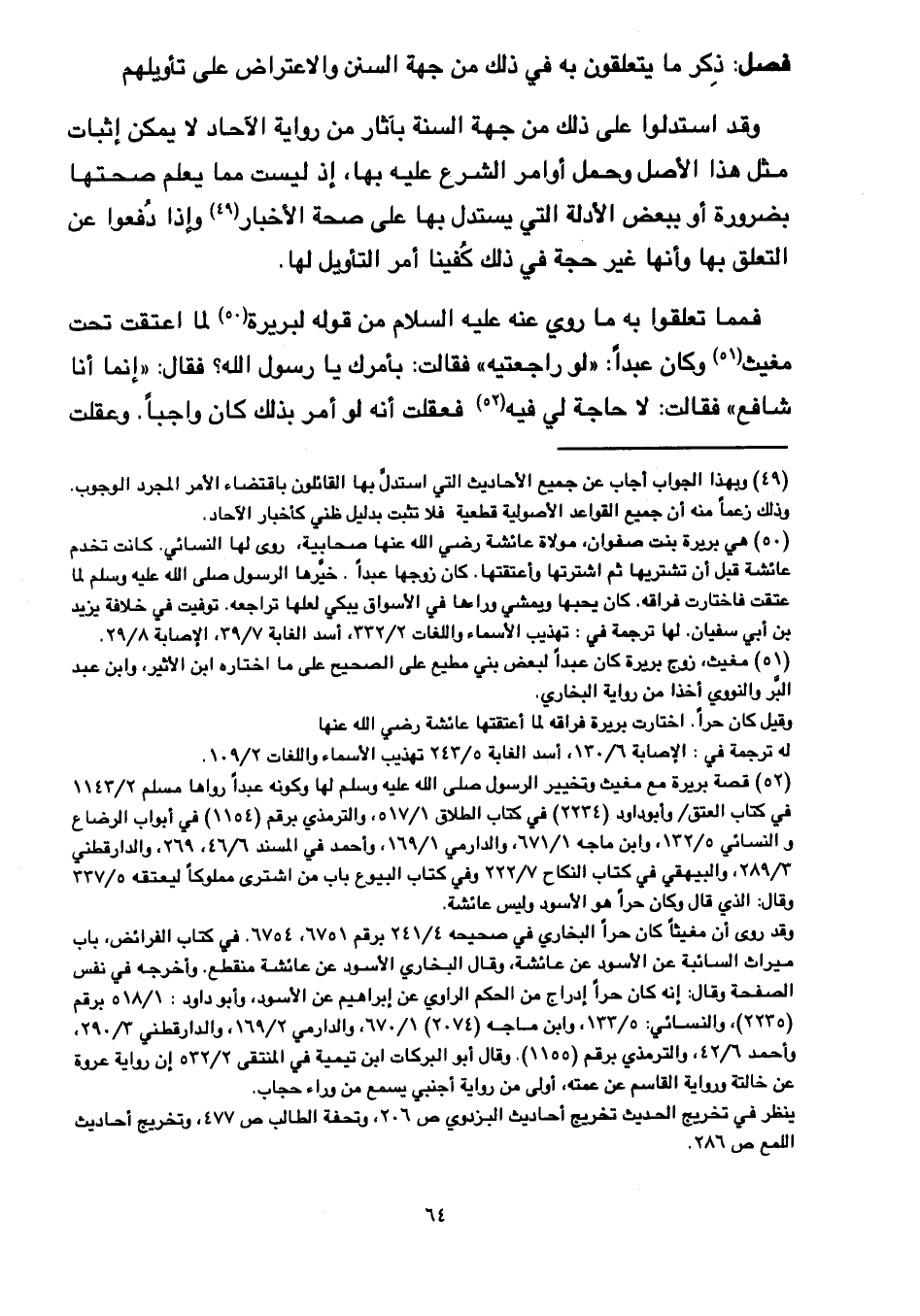 وقد استدلوا على ذلك من جهة السنة بآثار من رواية الآحاد لا يمكن إثبات مثل هذا الأصل وحمل أوامر الشرع عليه بها, إذ ليست مما يعلم صحتها بضرورة أو ببعض الأدلة التي يستدل بها على صحة الأخبار وإذا دفعوا عن التعلق بها وأنها غير حجة في ذلك كفينا أمر التأويل لها.