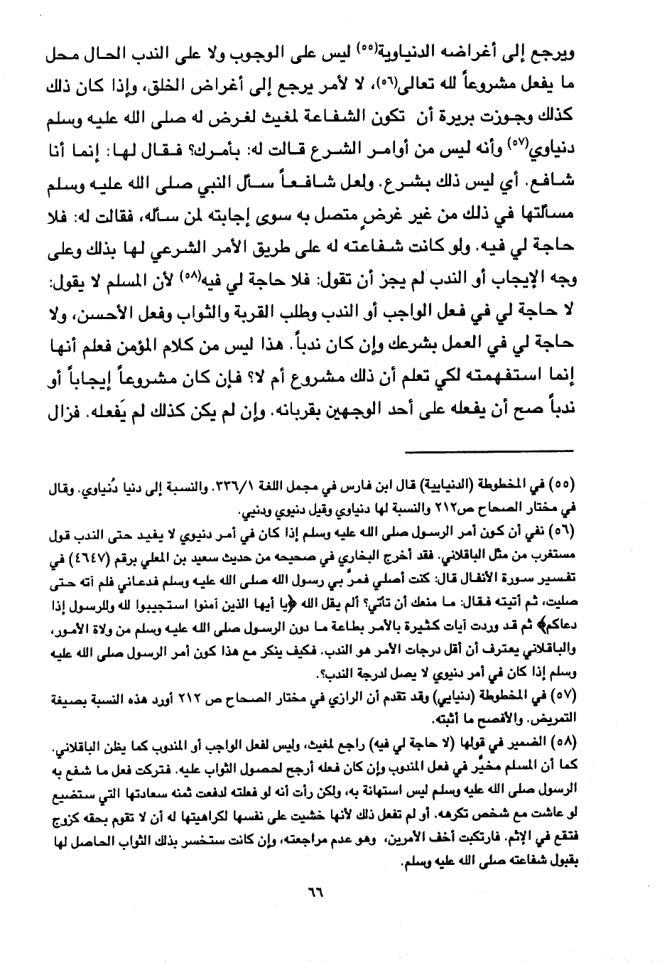 ويرجع إلى أغراضه الدنياوية ليس على الوجوب ولا على الندب الحال محل ما يفعل مشروعًا لله تعالى, لا لأمر يرجع إلى أغراض الخلق, وإذا كان ذلك كذلك وجوزت بريرة أن تكون الشفاعة لمغيث لغرض له صلى الله عليه وسلم دنياوي, وأنه ليس من أوامر الشرع قالت له: بأمرك؟ فقال لها: إنما أنا شافع, أي ليس ذلك بشرع, ولعل شافعًا سأل النبي صلى الله عليه وسلم مسألتها في ذلك من غير عرض متصل به سوى إجابته لمن سأله, فقالت له: فلا حاجة لي فيه, ولو كانت شفاعته له على طريق الأمر الشرعي لها بذلك وعلى وجه الإيجاب أو الندب لم يجز أن تقول: فلا حاجة لي فيه لأن المسلم لا يقول: لا حاجة لي في فعل الواجب أو الندب وطلب القربة والثواب وفعل الأحسن, ولا حاجة لي في العمل بشرعك وإن كان ندبًا, هذا ليس من كلام المؤمن فعلم أنها إنما استفهمته لكي تعلم أن ذلك مشروع أم لا؟ فإن كان مشروعًا إيجابًا أو ندبًا صح أن يفعله على أحد الوجهين بقربانه, وإن لم يكن كذلك لم يفعله فزال
