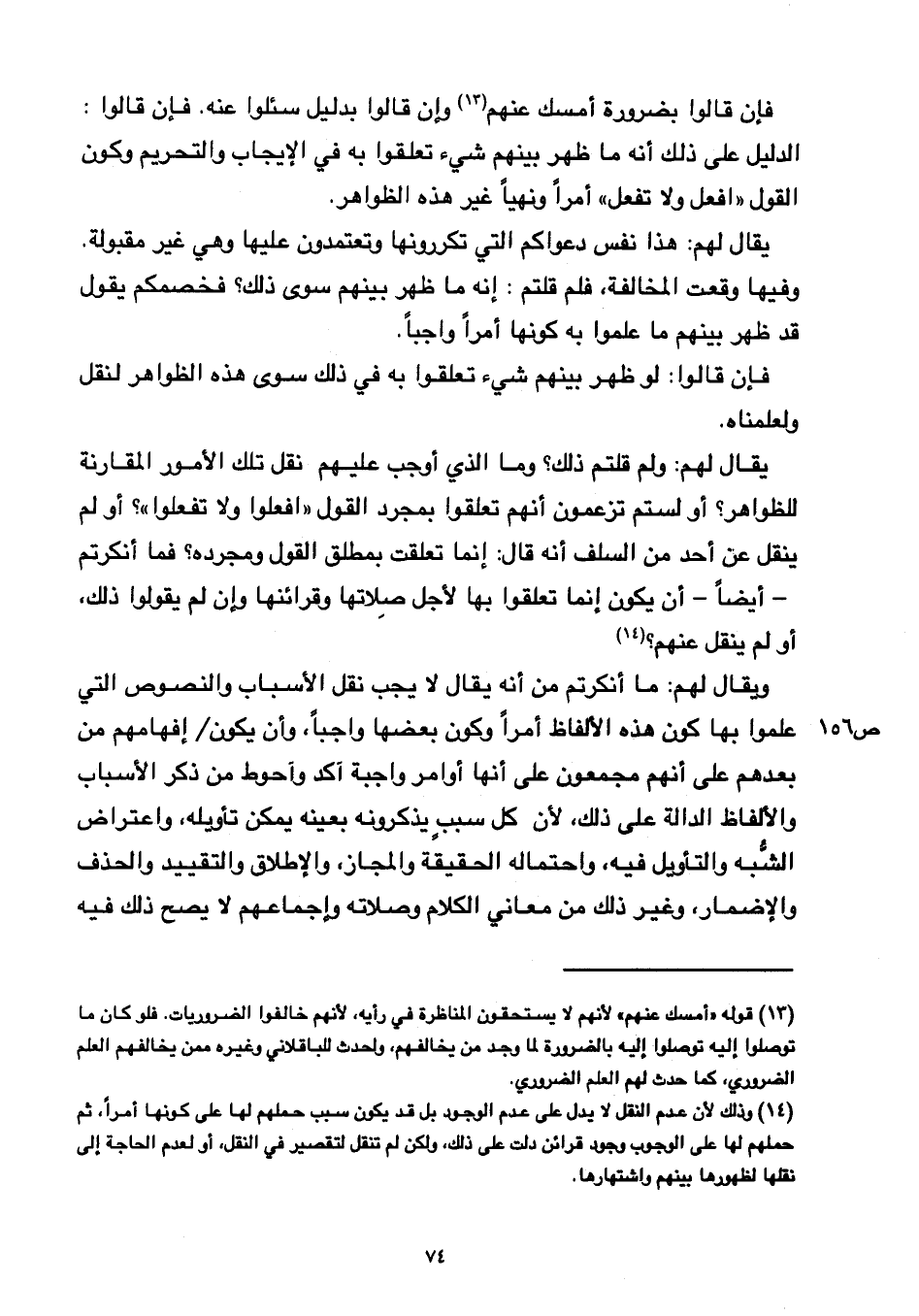 ويقال لهم: ما أنكرتم من أنه يقال لا يجب نقل الأسباب والنصوص التي علموا بها كون هذه الألفاظ أمرًا وكون بعضها واجبًا, وأن يكون / ص ١٥٦ إفهامهم من بعدهم على أنهم مجمعون على أنها أوامر واجبة آكد وأحوط من ذكر الأسباب والألفاظ الدالة على ذلك, لأن كل سبب يذكرونه بعينه يمكن تأويله, واعتراض الشبه والتأويل فيه, واحتماله الحقيقة والمجاز, والإطلاق والتقييد والحذف والإضمار, وغير ذلك من معاني الكلام وصلاته وإجماعهم لا يصح ذلك فيه