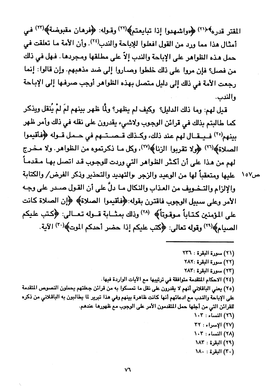 قيل لهم: وما ذلك الدليل؟ وكيف لم يظهر؟ ولما ظهر بينهم لم لم ينقل ويذكر كما طالبتم بذلك في قرائن الوجوب ولا شيء يقدرون على نقله في ذلك وأمر ظهر بينهم فيقال لهم عند ذلك, وكذلك قصتهم في حمل قوله {فَأَقِيمُوا الصَّلَاةَ} {وَلاَ تَقْرَبُوا الزِّنَى} , وكل ما ذكرتموه من الظواهر, ولا مخرج لهم من هذا على أن أكثر الظواهر التي وردت للوجوب قد اتصل بها مقدمًا عليها ومتعقبًا لها من الوعيد والزجز, والتهديد والتحذير وذكر الفرض والكتابة والإلزام والتخويف من العذاب والنكال وما دل على أن القول صدر على وجه الأمر وعلى سبيل الوجوب فاقترن بقوله: {فَأَقِيمُوا الصَّلَاةَ} {إِنَّ الصَّلَاةَ كَانَتْ عَلَى الْمُؤْمِنِينَ كِتَابًا مَّوْقُوتًا} وذلك بمثابة قوله تعالى {كُتِبَ عَلَيْكُمُ الصِّيَامُ} وقوله تعالى: {كُتِبَ عَلَيْكُمْ إِذَا حَضَرَ أَحَدَكُمُ الْمَوْتُ} الآية.