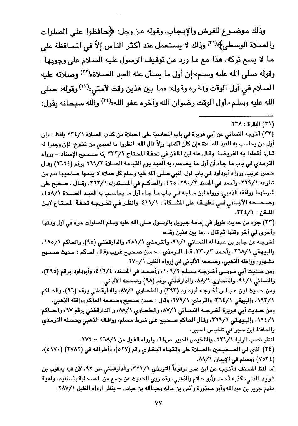 وذلك موضوع للفرض والإيجاب, وقوله عز وجل: {حَافِظُوا عَلَى الصَّلَوَاتِ وَالصَّلَاةِ الْوُسْطَى} وذلك لا يستعمل عند أكثر الناس إلا في المحافظة على ما لا يسع تركه هذا مع ما ورد من توقيف الرسول عليه السلام على وجوبها, وقوله صلى الله عليه وسلم "إن أول ما يسأل عنه العبد الصلاة" وصلاته عليه السلام في أول الوقت وآخره وقوله: "ما بين هذين وقت لأمتي" وقوله: صلى الله عليه وسلم "أول الوقت رضوان الله وآخره عفو الله" والله سبحانه يقول: