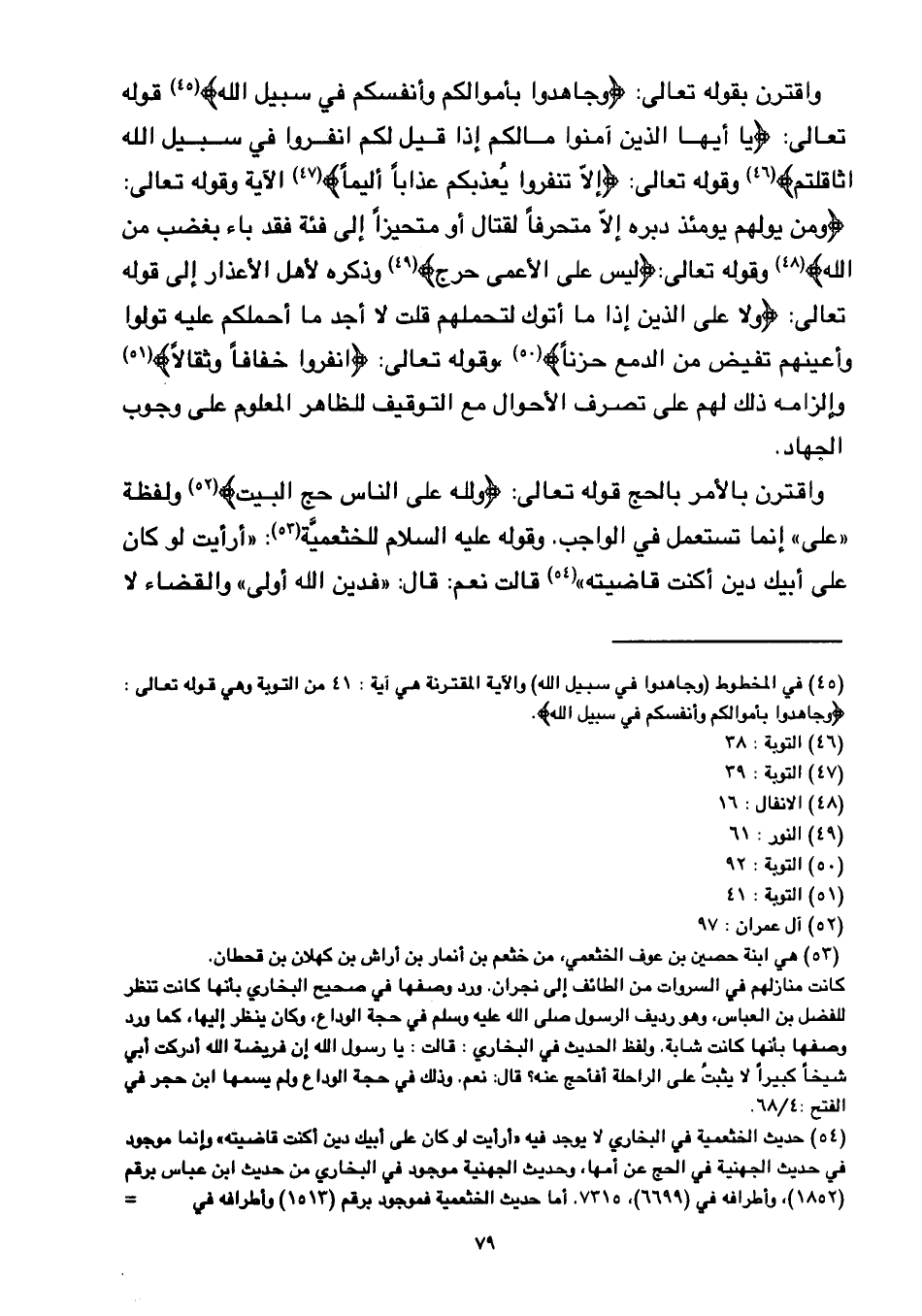 واقترن بقوله تعالى: {وَجَاهِدُوا بِأَمْوَالِكُمْ وَأَنْفُسِكُمْ فِي سَبِيلِ اللَّهِ} قوله تعالى: {يَا أَيُّهَا الَّذِينَ آمَنُوا مَا لَكُمْ إِذَا قِيلَ لَكُمُ انفِرُوا فِي سَبِيلِ اللهِ اثَّاقَلْتُمْ} وقوله تعالى: {إِلاَّ تَنفِرُوا يُعَذِّبْكُمْ عَذَاباً أَلِيماً} الآية وقوله تعالى: {وَمَنْ يُوَلِّهِمْ يَوْمَئِذٍ دُبُرَهُ إِلَّا مُتَحَرِّفًا لِقِتَالٍ أَوْ مُتَحَيِّزًا إِلَى فِئَةٍ فَقَدْ بَاءَ بِغَضَبٍ مِنَ اللَّهِ} وقوله تعالى: {لَيْسَ عَلَى الْأَعْمَى حَرَجٌ} وذكره لأهل الأعذار إلى قوله تعالى: {وَلَا عَلَى الَّذِينَ إِذَا مَا أَتَوْكَ لِتَحْمِلَهُمْ قُلْتَ لَا أَجِدُ مَا أَحْمِلُكُمْ عَلَيْهِ تَوَلَّوْا وَأَعْيُنُهُمْ تَفِيضُ مِنَ الدَّمْعِ حَزَنًا} وقوله تعالى: {انْفِرُوا خِفَافًا وَثِقَالًا} وإلزامه ذلك على تصرف الأحوال مع التوقيف للظاهر المعلوم على وجوب الجهاد.