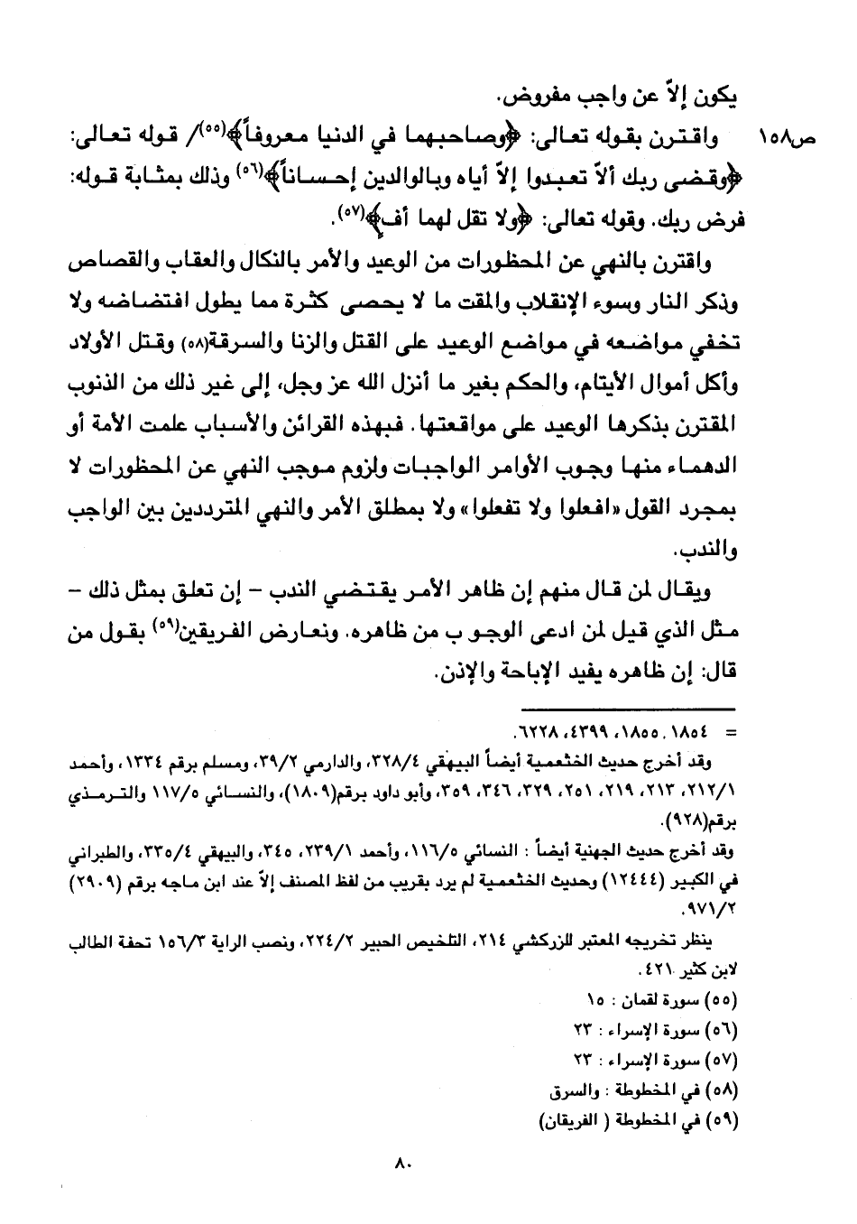 واقترن بقوله تعالى: {وَصَاحِبْهُمَا فِي الدُّنْيَا مَعْرُوفًا} / ص ١٥٨ قوله تعالى: {وَقَضَى رَبُّكَ أَلاَّ تَعْبُدُوا إِلاَّ إِيَّاهُ وَبِالْوَالِدَيْنِ إِحْسَانًا} , وذلك بمثابة قوله: فرض ربك, وقوله تعالى: {فَلا تَقُلْ لَهُمَا أُفٍّ}.