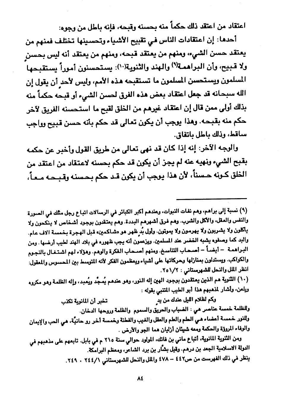 أحدها: إن اعتقادات الناس في تقبيح الأشياء وتحسينها تختلف فمنهم من يعتقد حسن الشيء, ومنهم من يعتقد قبحه, ومنهم من يعتقد أنه ليس بحسن ولا قبيح, وأن البراهمة والهند والثنوية: يستحسنون أمورًا يستقبحها المسلمون ويستحسن المسلمون ما تستقبحه هذه الأمم, وليس لأحد أن يقول إن الله سبحانه قد جعل اعتقاد بعض هذه الفرق لحسن الشيء أو قبحه حكمًا منه بذلك أولى ممن قال إن اعتقاد غيرهم من الخلق لقبح ما استحسنه الفريق الآخر حكم منه بقبحه, وهذا يوجب أن يكون تعالى قد حكم بأنه حسن قبيح وواجب ساقط, وذلك باطل باتفاق.