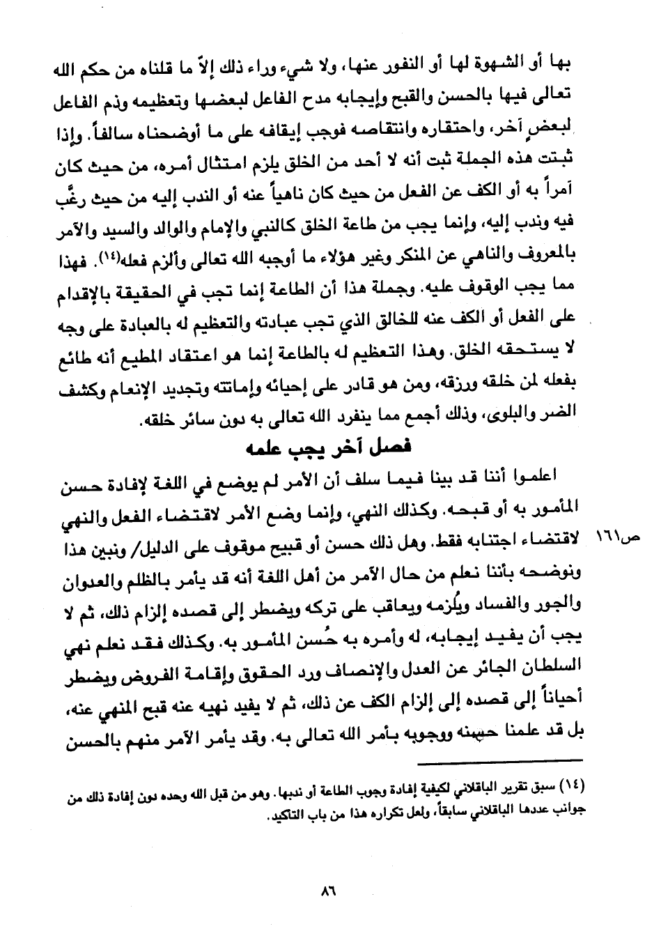 اعلموا أننا قد بينا فيما سلف أن الأمر لم يوضع في اللغة لإفادة حسن المأمور به أو قبحه, وكذلك النهي, وإنما وضع الأمر لاقتضاء الفعل والنهي لاقتضاء اجتنابه فقط, وهل ذلك حسن أو قبيح موقوف على الدليل/ ص ١٦١ ونبين هذا ونوضحه بأننا نعلم من حال الآمر من أهل اللغة أنه قد يأمر بالظلم والعدوان والجور والفساد ويلزمه ويعاقب على تركه ويضطر إلى قصده إلزام ذلك, ثم لا يجب أن يفيد إيجابه له وأمره به حسن المأمور به, وكذلك فقد نعلم نهي السلطان الجائر عن العدل والإنصاف ورد الحقوق وإقامة الفروض ويضطر أحيانًا إلى قصده إلى إلزام الكف عن ذلك, ثم لا يفيد نهيه عنه قبح المنهي عنه, بل قد علمنا حسنه ووجوبه بأمر الله تعالى به, وقد يأمر الآمر منهم بالحسن