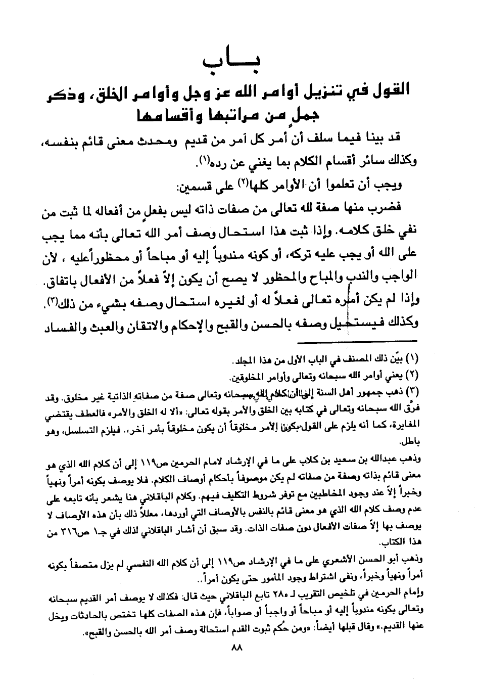فضرب منها صفة لله تعالى من صفات ذاته ليس بفعل من أفعاله لما ثبت من نفي خلق كلامه, وإذا ثبت هذا استحال وصف أمر الله تعالى بأنه مما يجب على الله أو يجب عليه تركه, أو كونه مندوبًا إليه أو مباحًا أو محظورًا عليه, لأن الواجب والندب والمباح والمحظور لا يصح أن يكون إلا فعلًا من الأفعال باتفاق. وإذا لم يكن أمره تعالى فعلًا له أو لغيره استحال وصفه بشيء من ذلك, وكذلك فيستحيل وصفه بالحسن والقبح والإحكام والإتقان والعبث والفساد